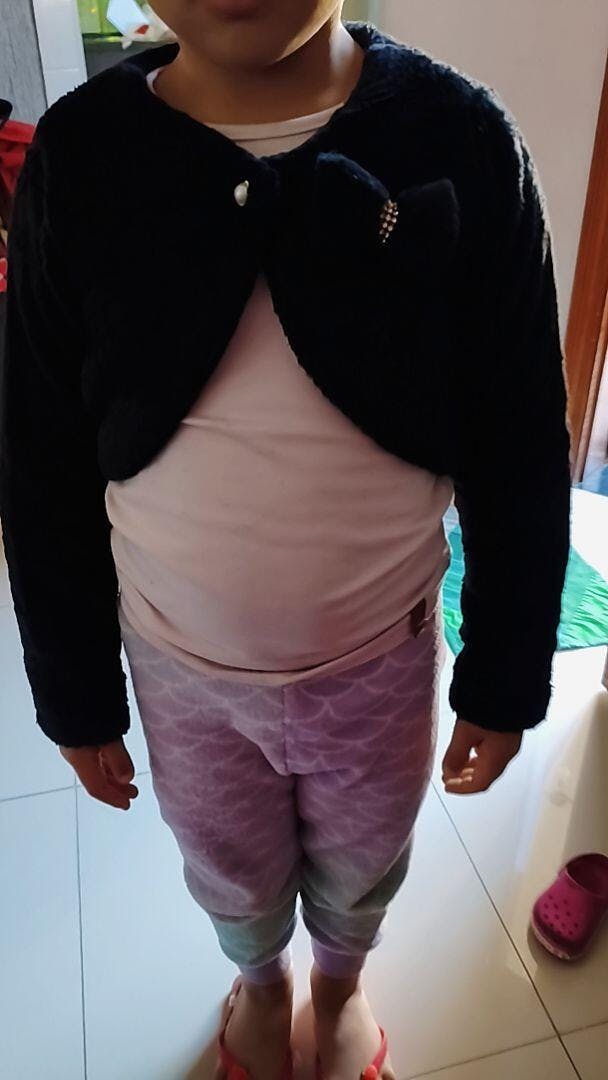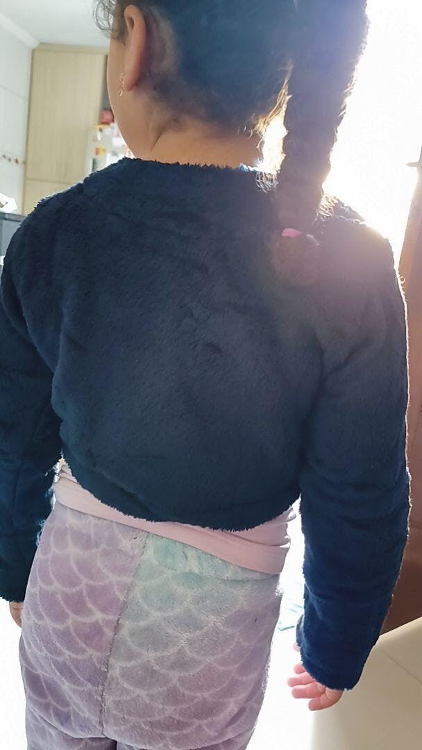 * Bolero infantil em pelúcia, com botão e laço de strass.