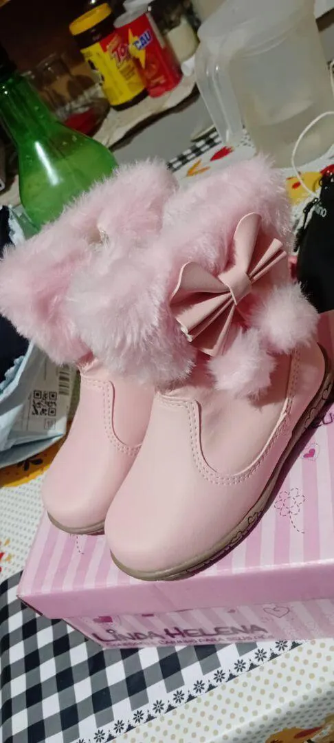 * Botinha infantil em courino Pelúcia. Com laço e pompom.