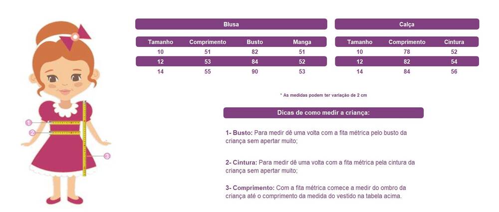 * Conjunto veste crianças de 4 a 8 anos.