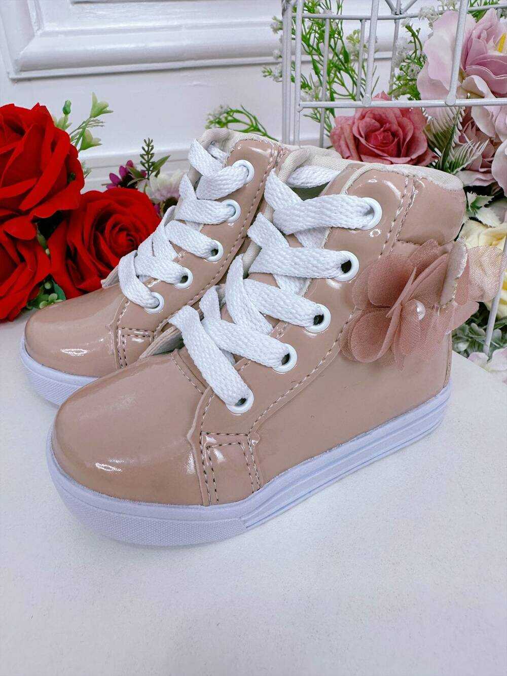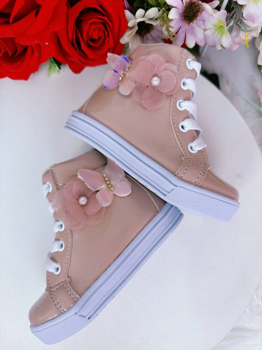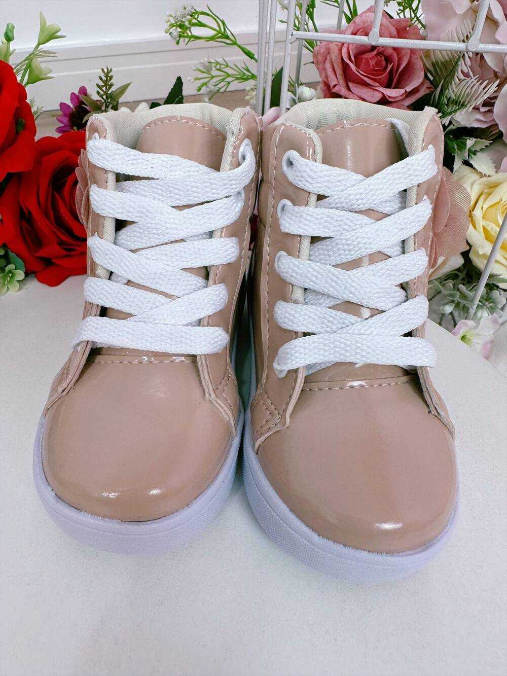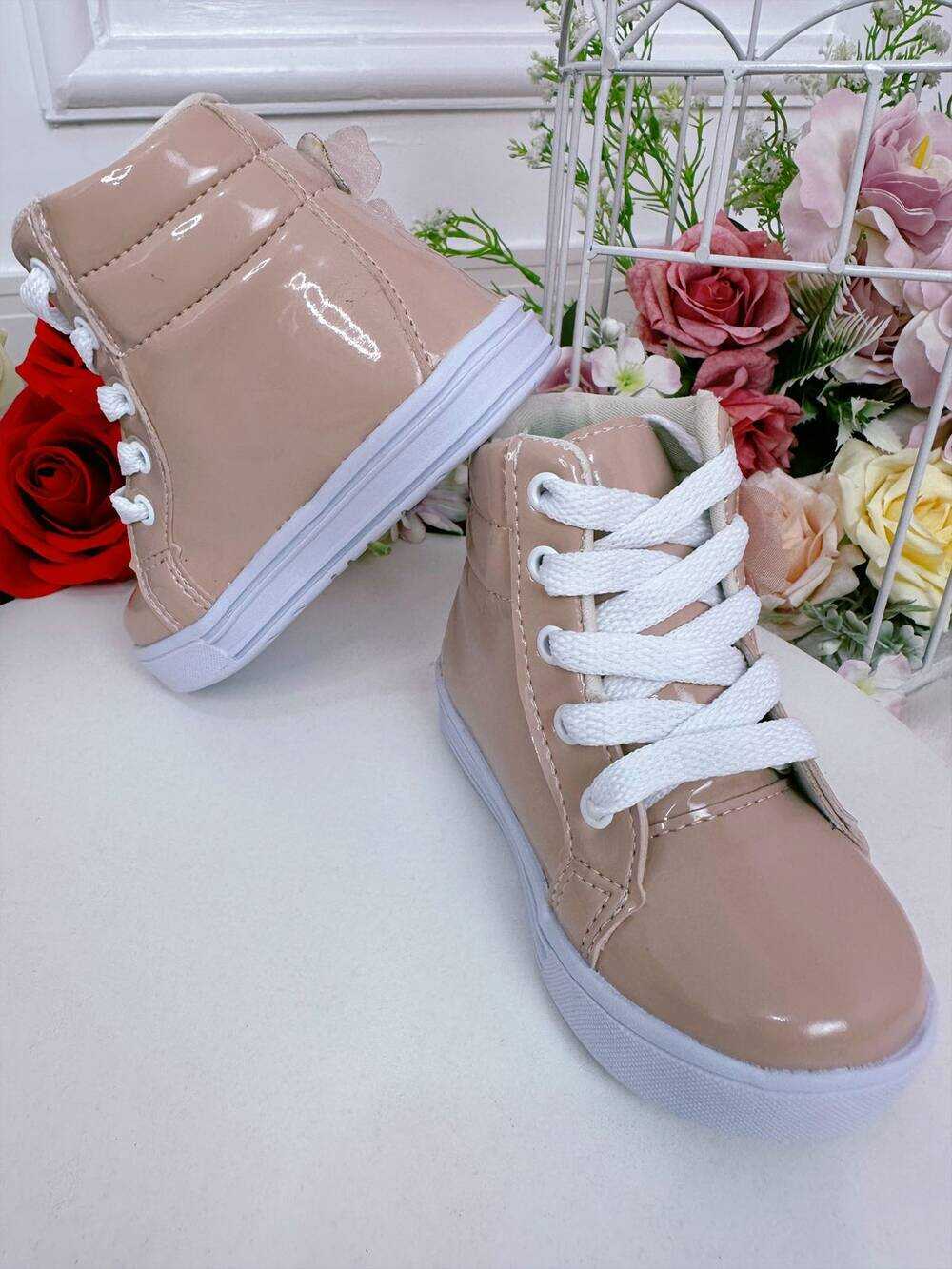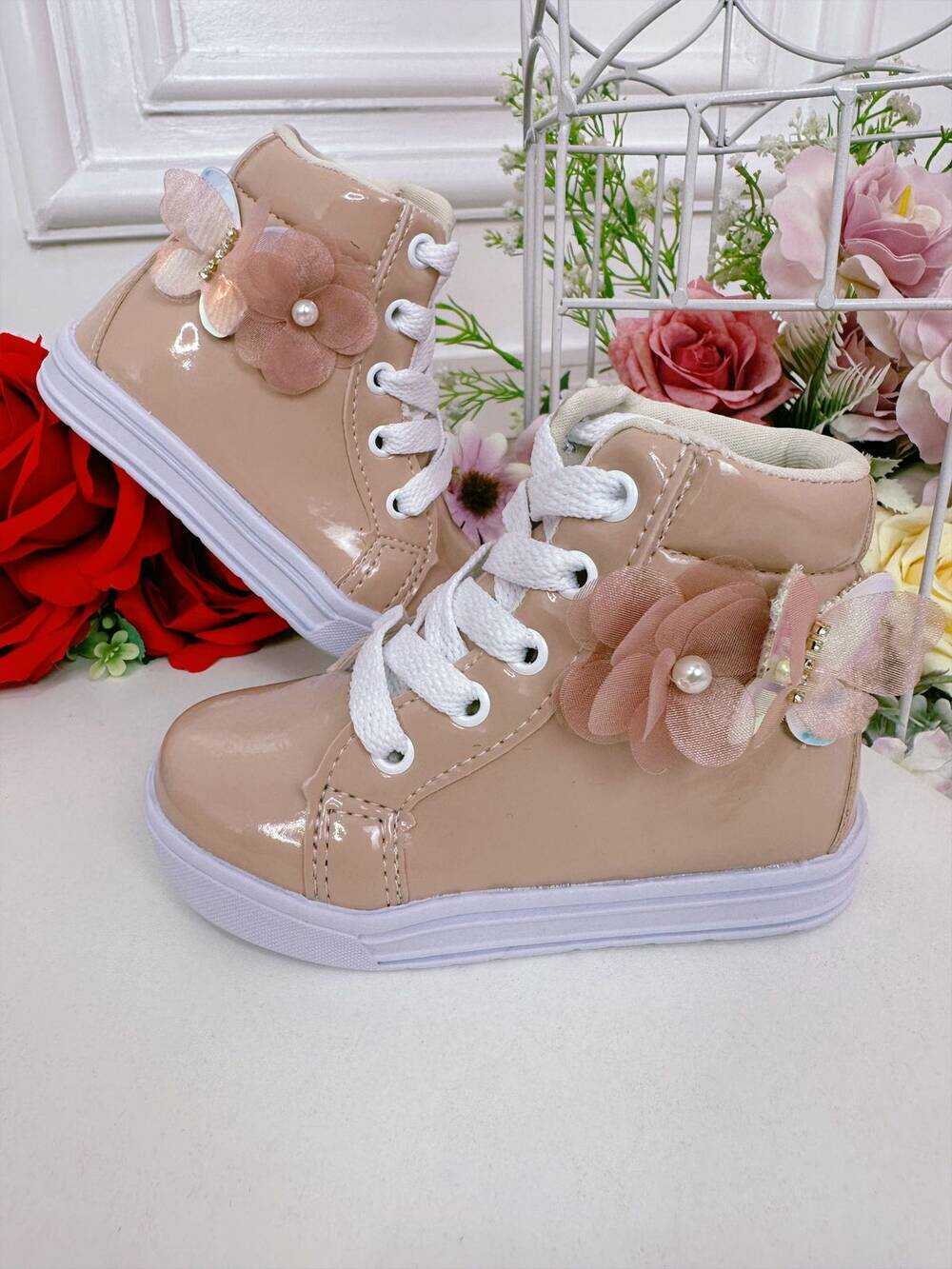 • Coturno Infantil Nude Verniz C/ Cadarço Florzinha Borboleta