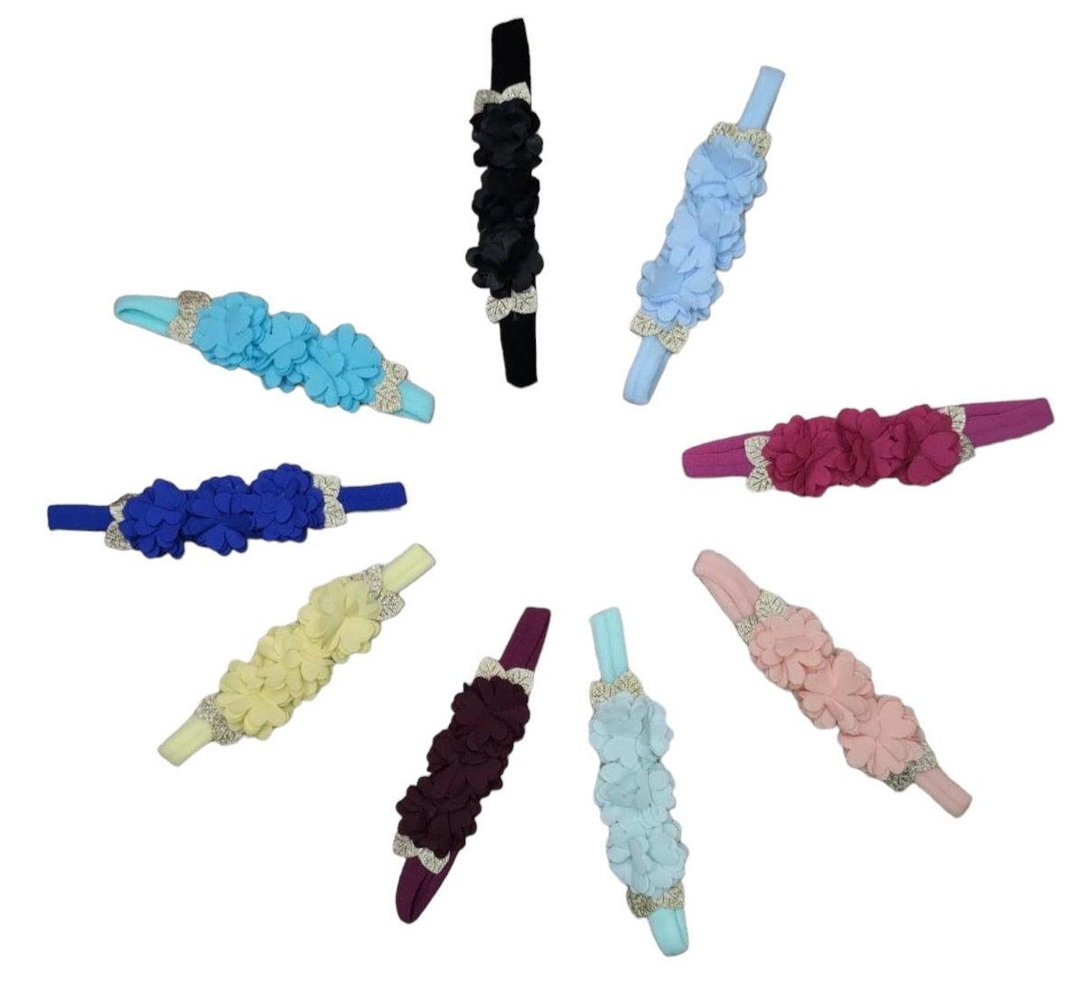Faixinha de Cabelo Bebê Aplique de Flores Dourada Várias Cores