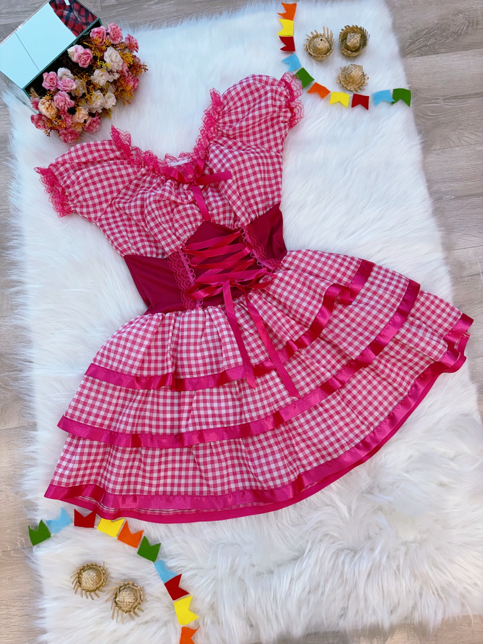 Fantasia Adulto Junino Arraiá Rosa Chiclete Xadrez Festas