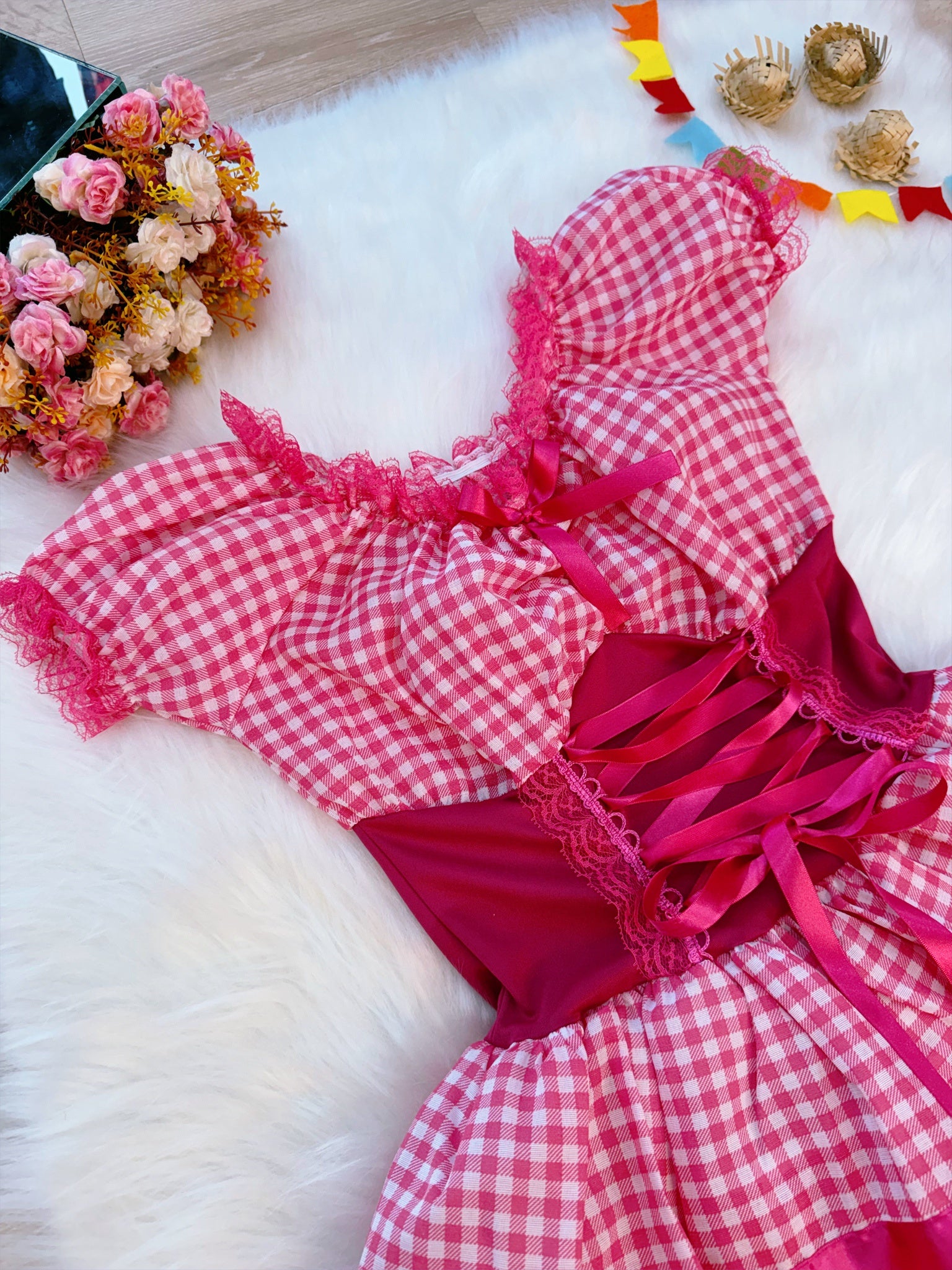 • Fantasia Adulto Junino Arraiá Rosa Chiclete Xadrez Festas