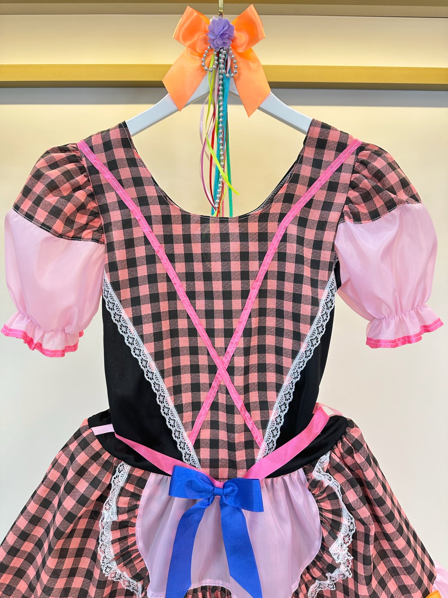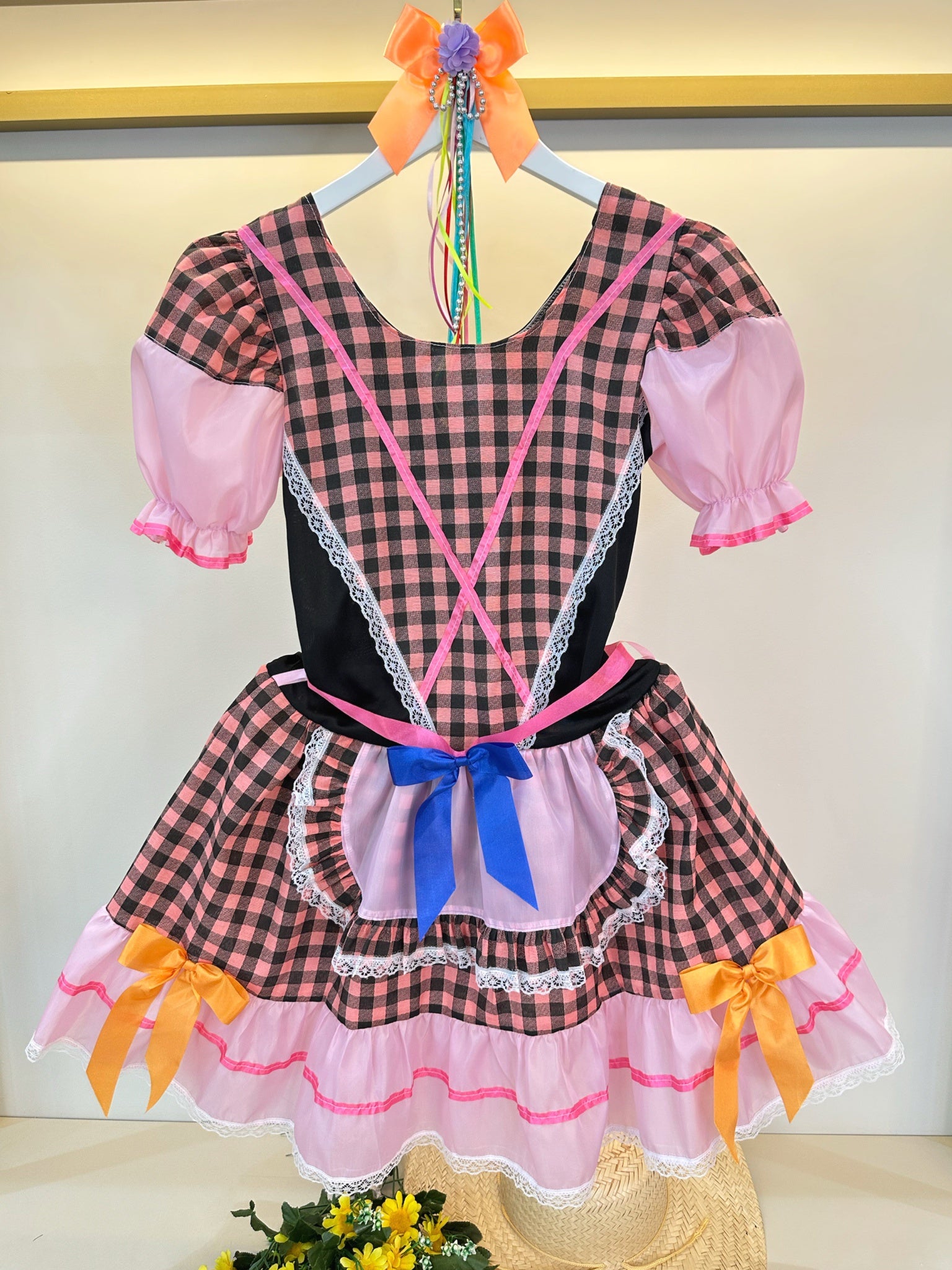 Fantasia Adulto Junino Arraiá Rosa e Preto Xadrez Colorido