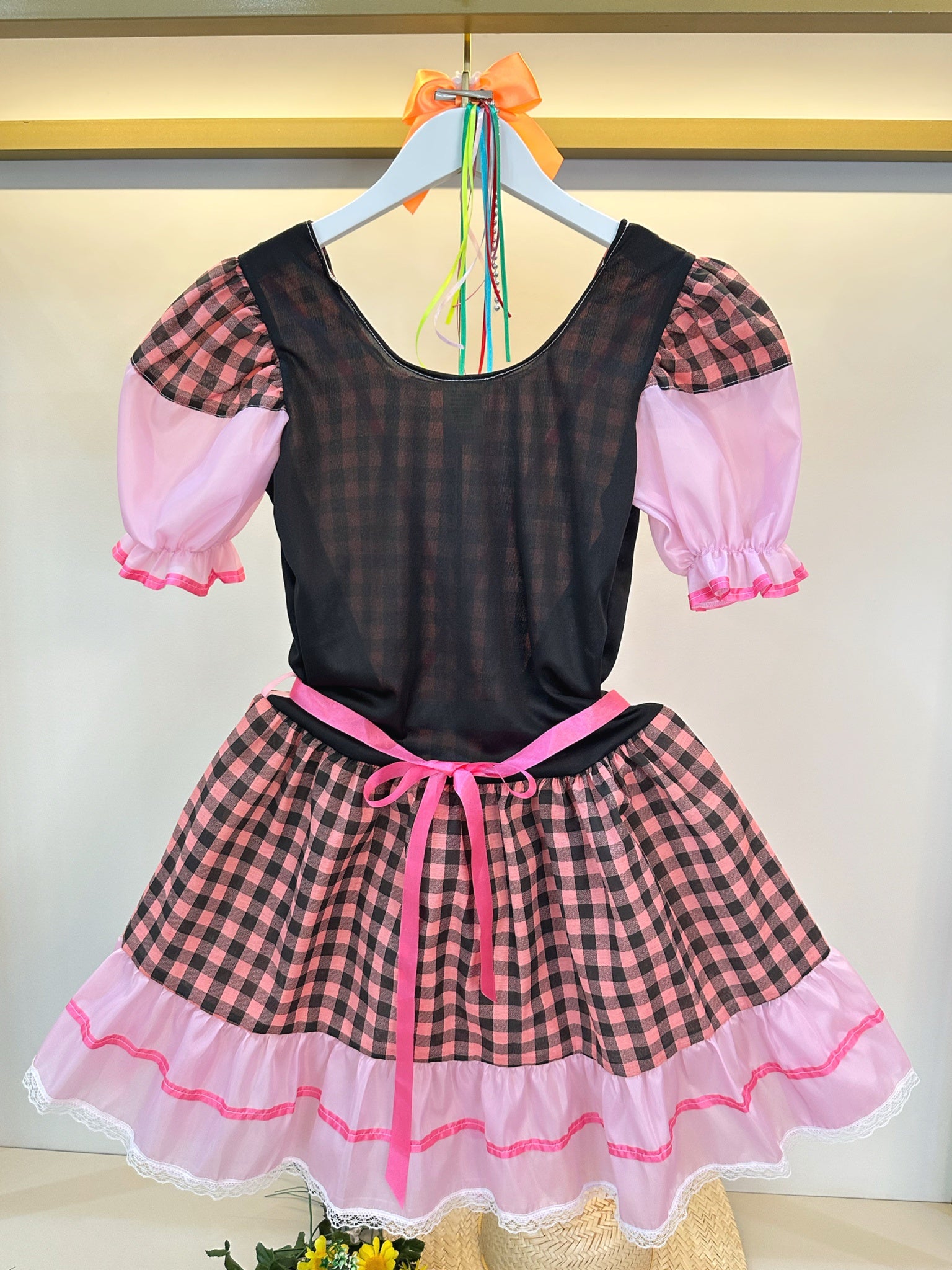 • Fantasia Adulto Junino Arraiá Rosa e Preto Xadrez Colorido