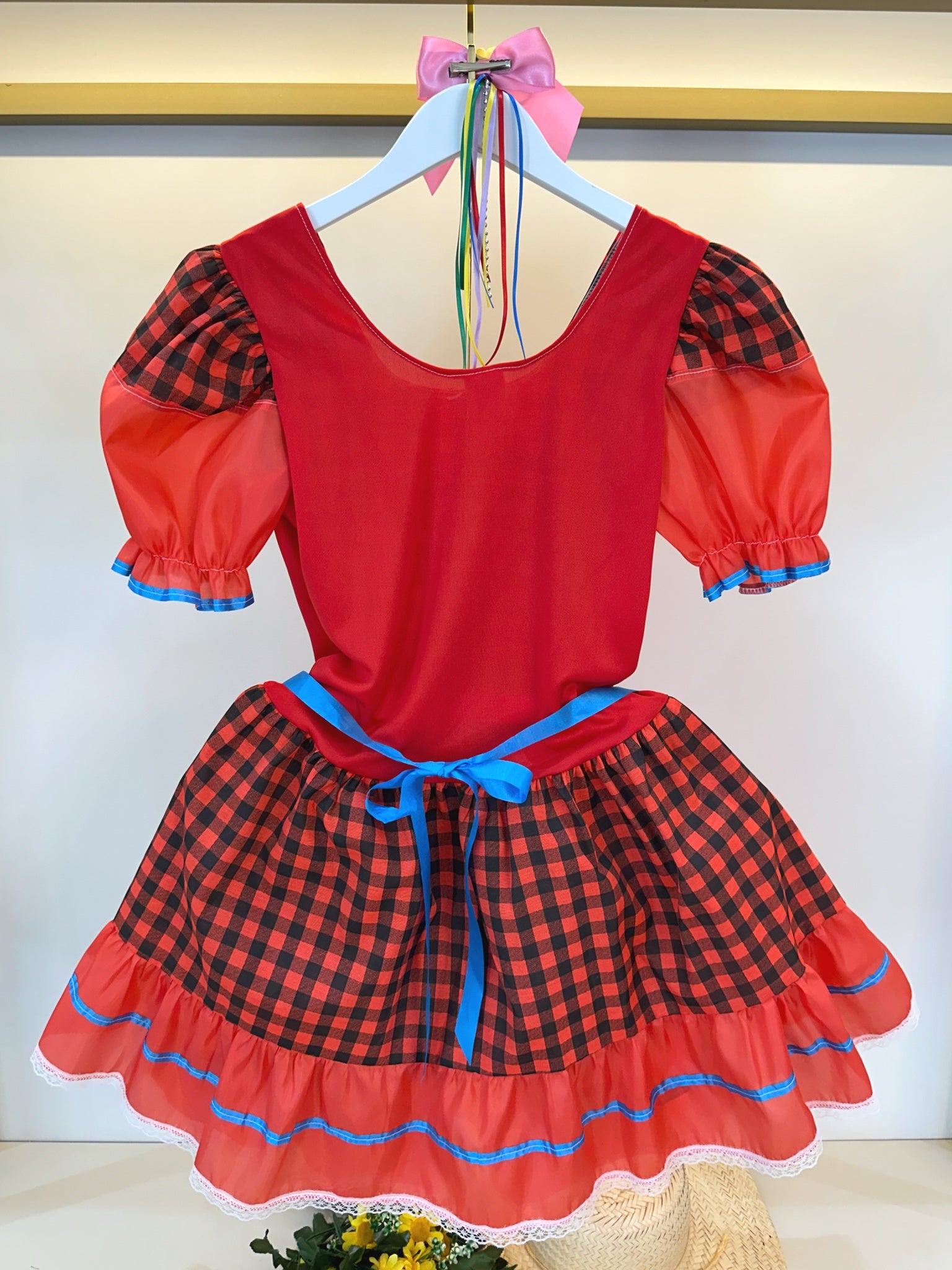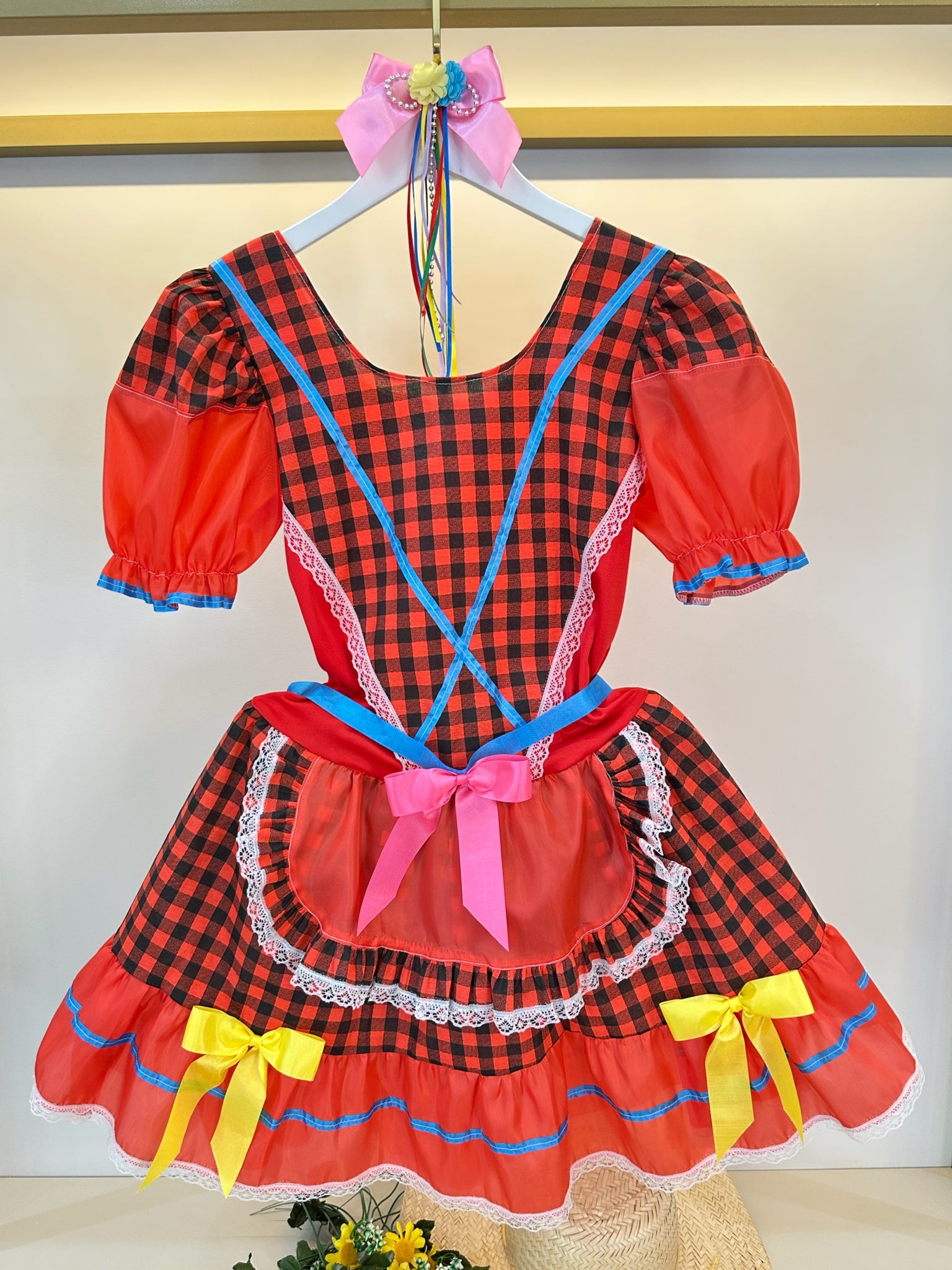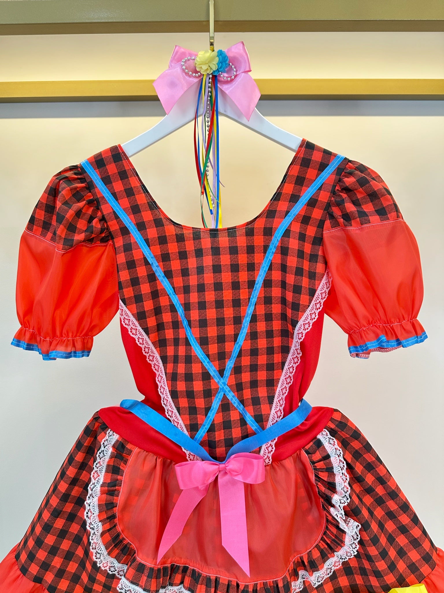 • Fantasia Adulto Junino Arraiá Vermelho e Preto Xadrez Colorido