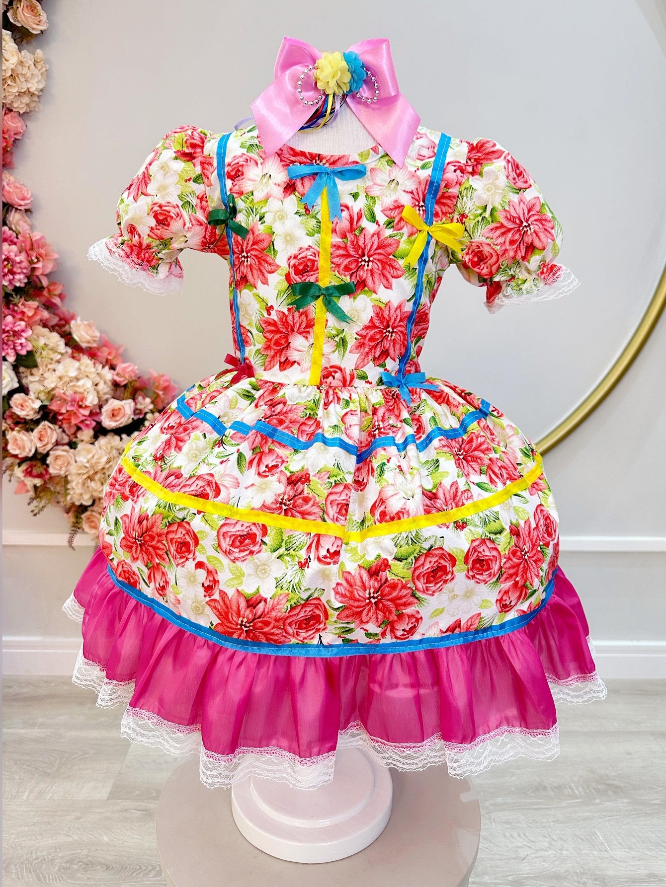 Fantasia Infantil Junino Arraiá Rosa C/ Desenho de Flores