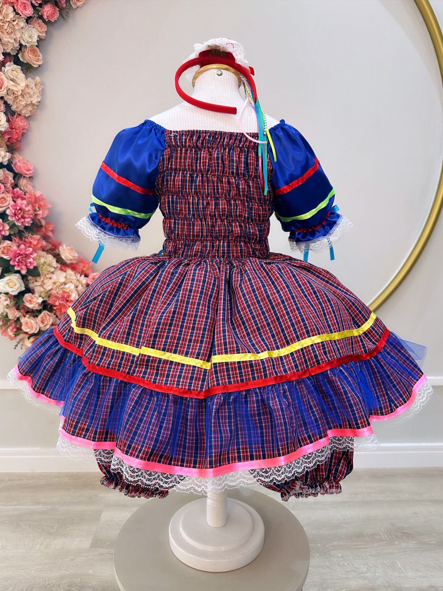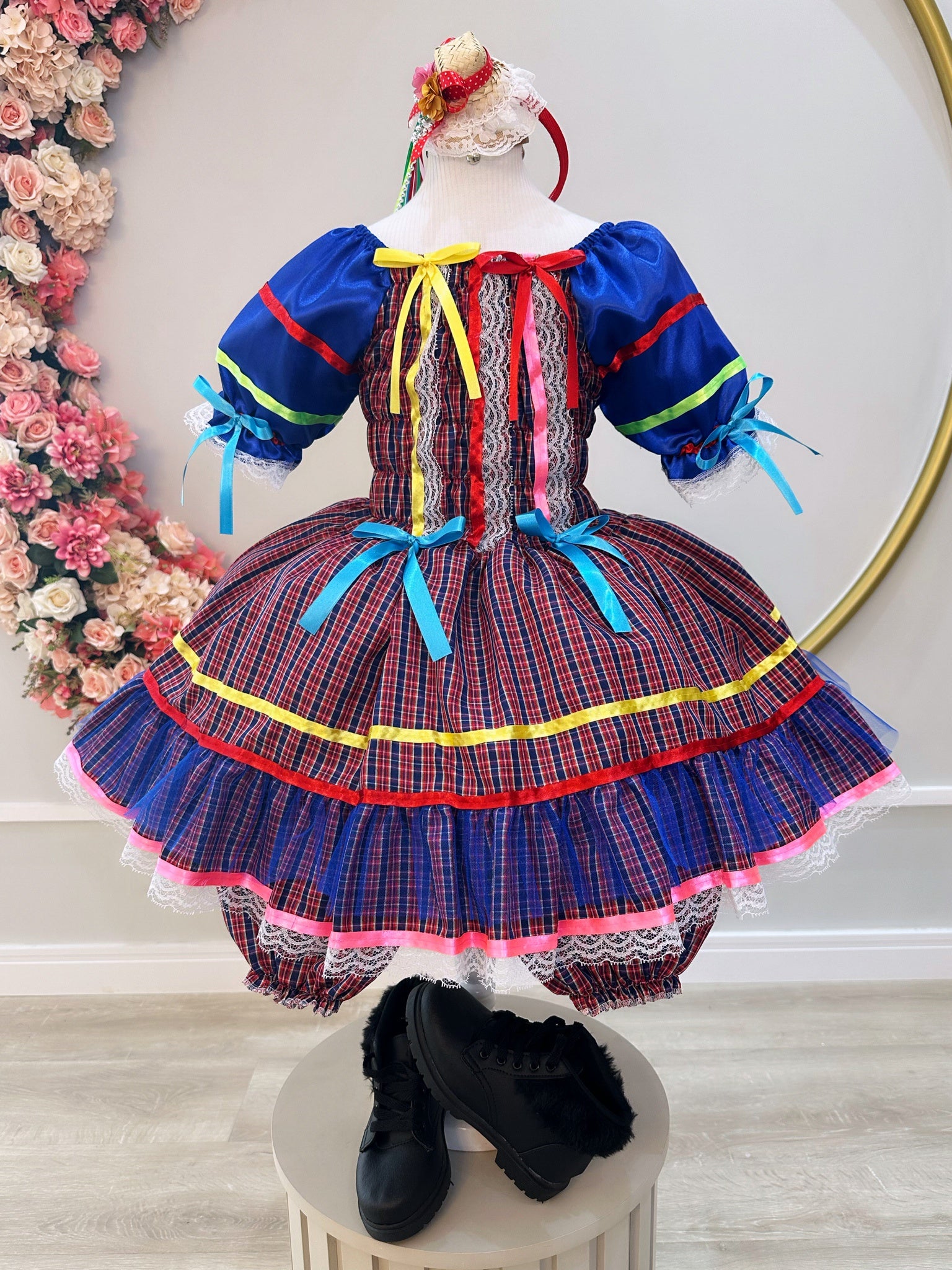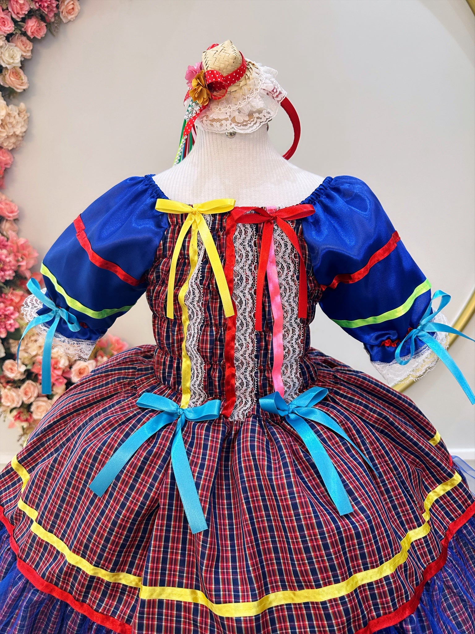 • Fantasia Infantil Junino Azul Colorido Xadrez Festas