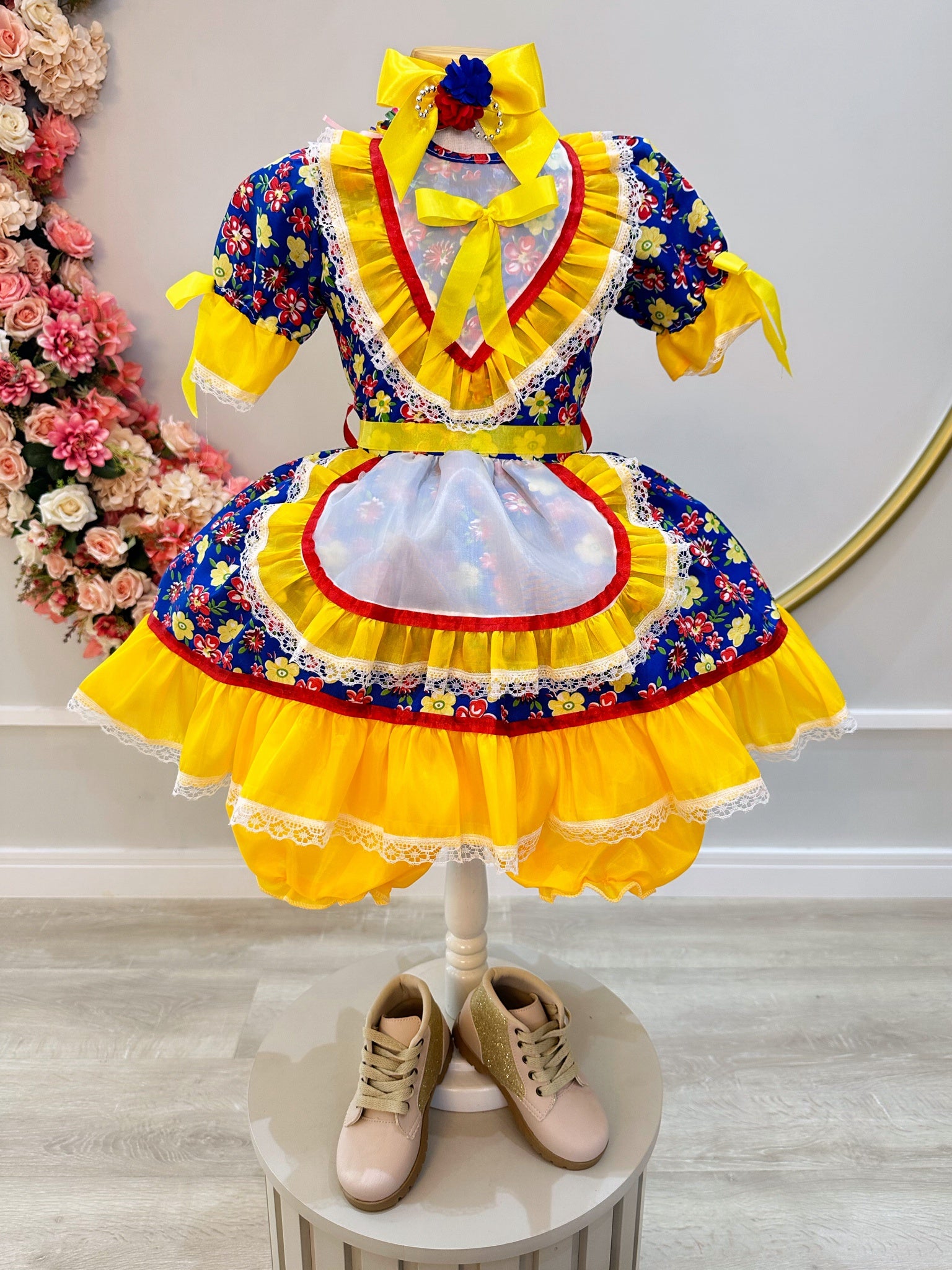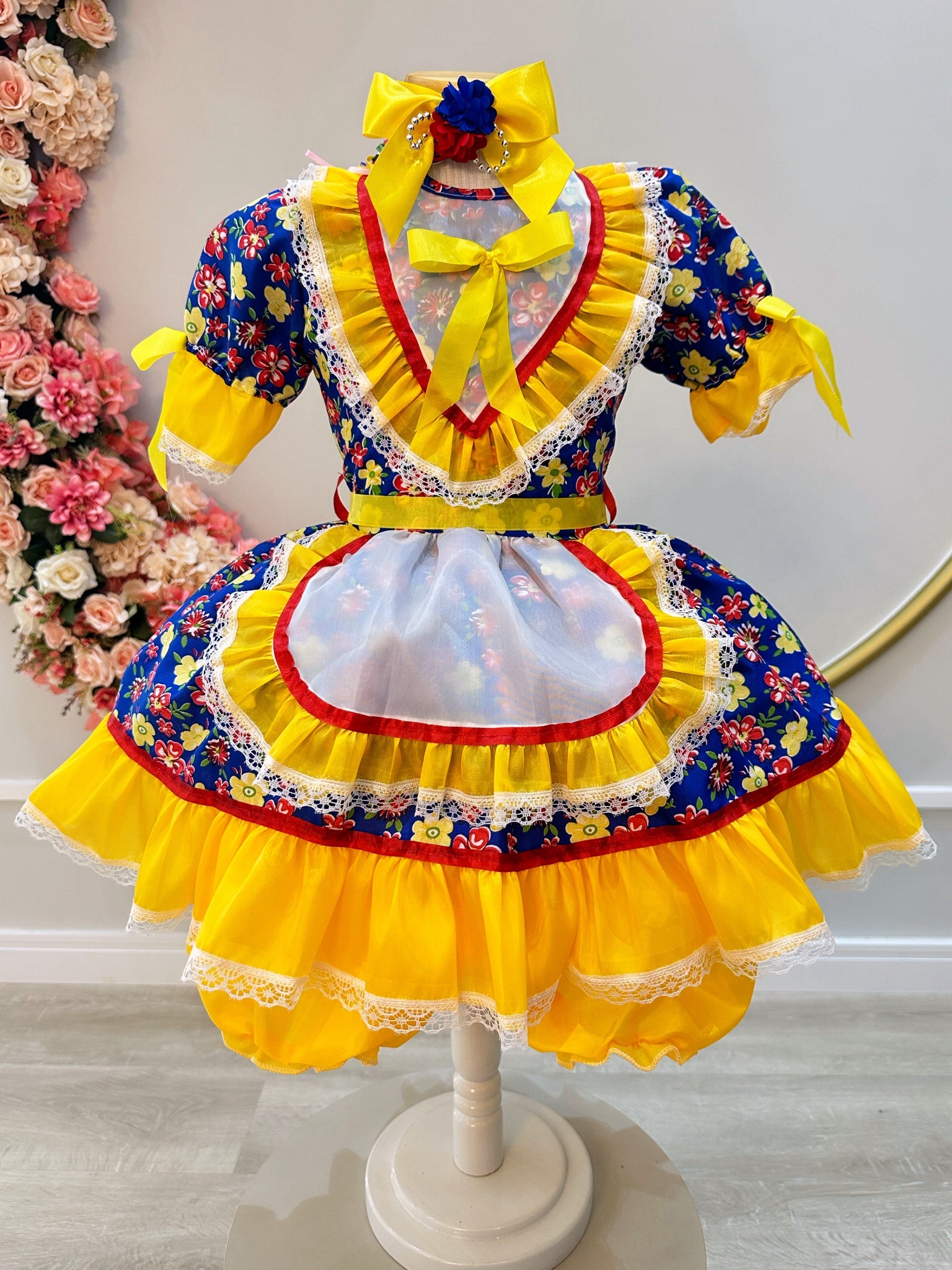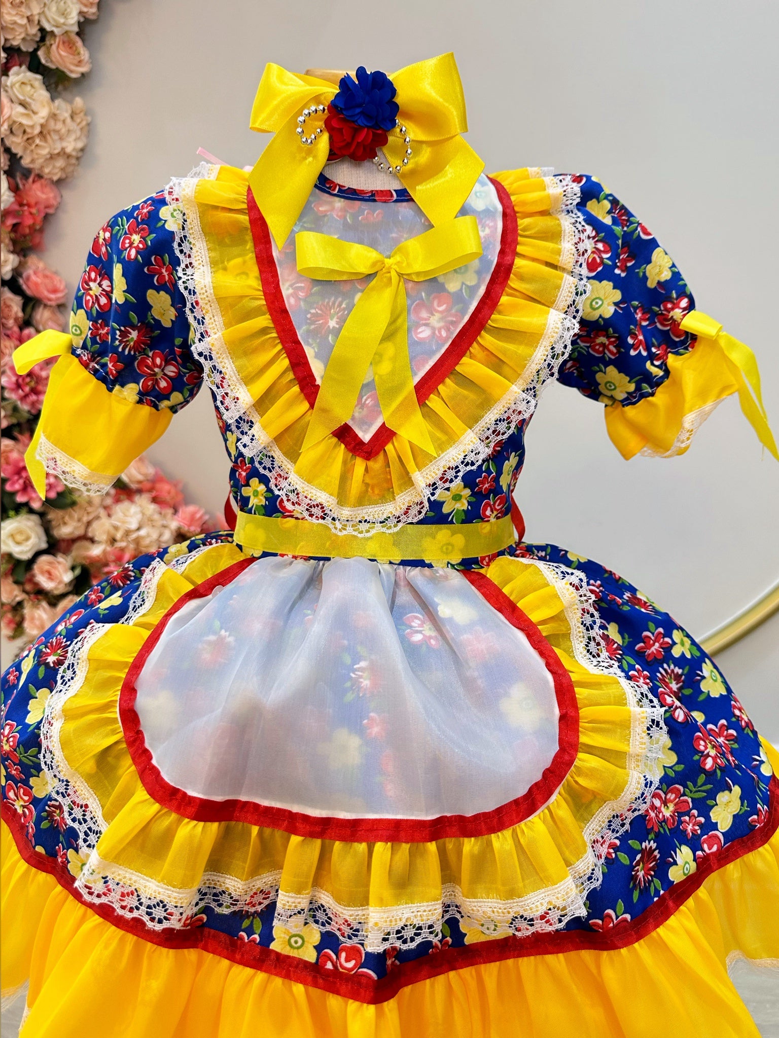 • Fantasia Infantil Junino Azul Com Desenho Colorido de Flores
