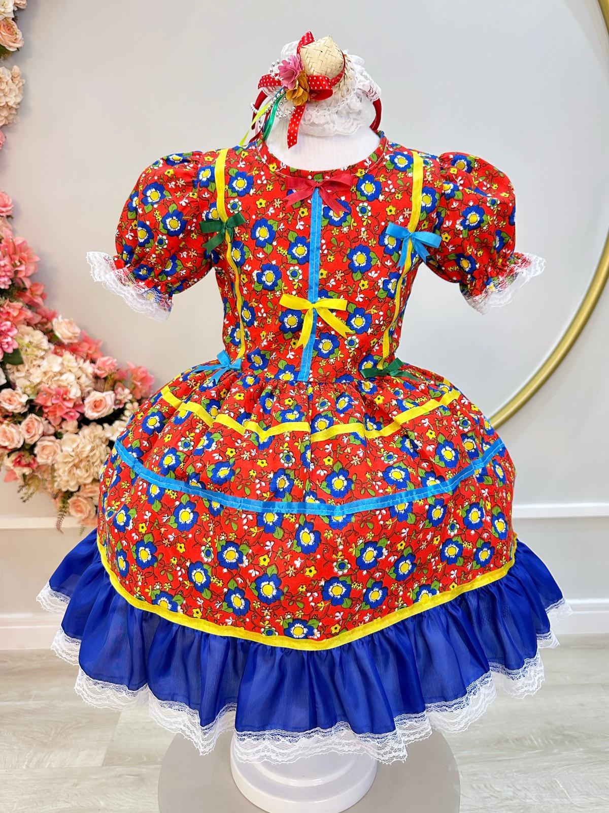 Fantasia Infantil Junino Vermelho C/ Desenho de Flores