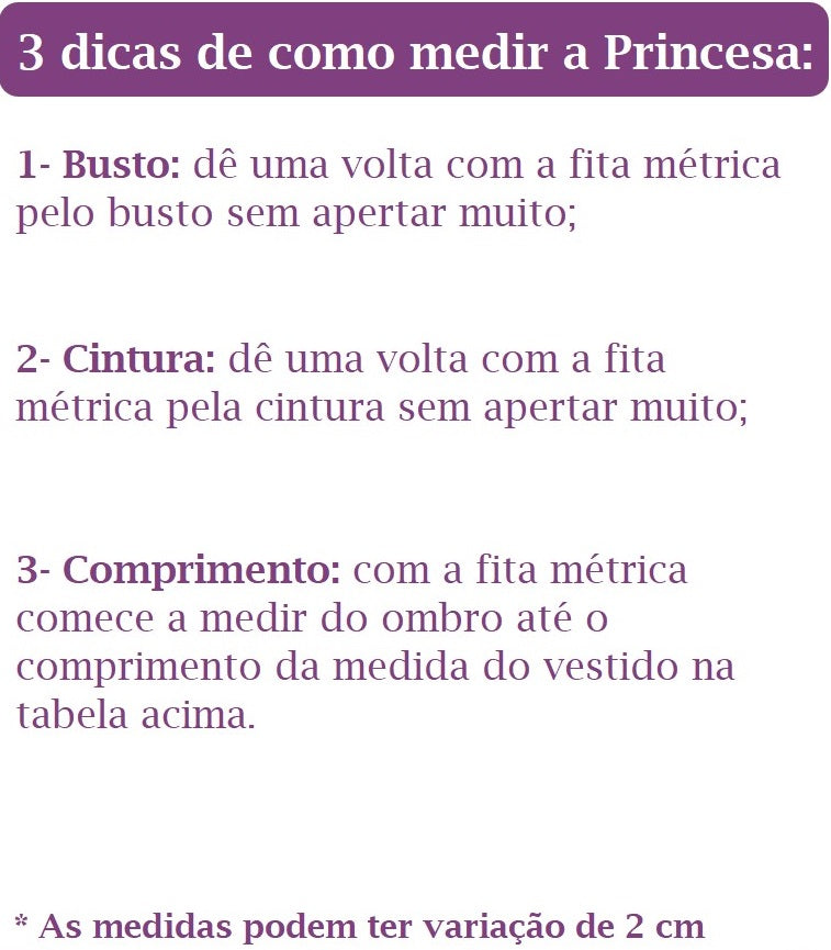 * Laço, tiara e acessórios que acompanham a foto poderão não fazer parte do vestido e são vendidos separadamente;