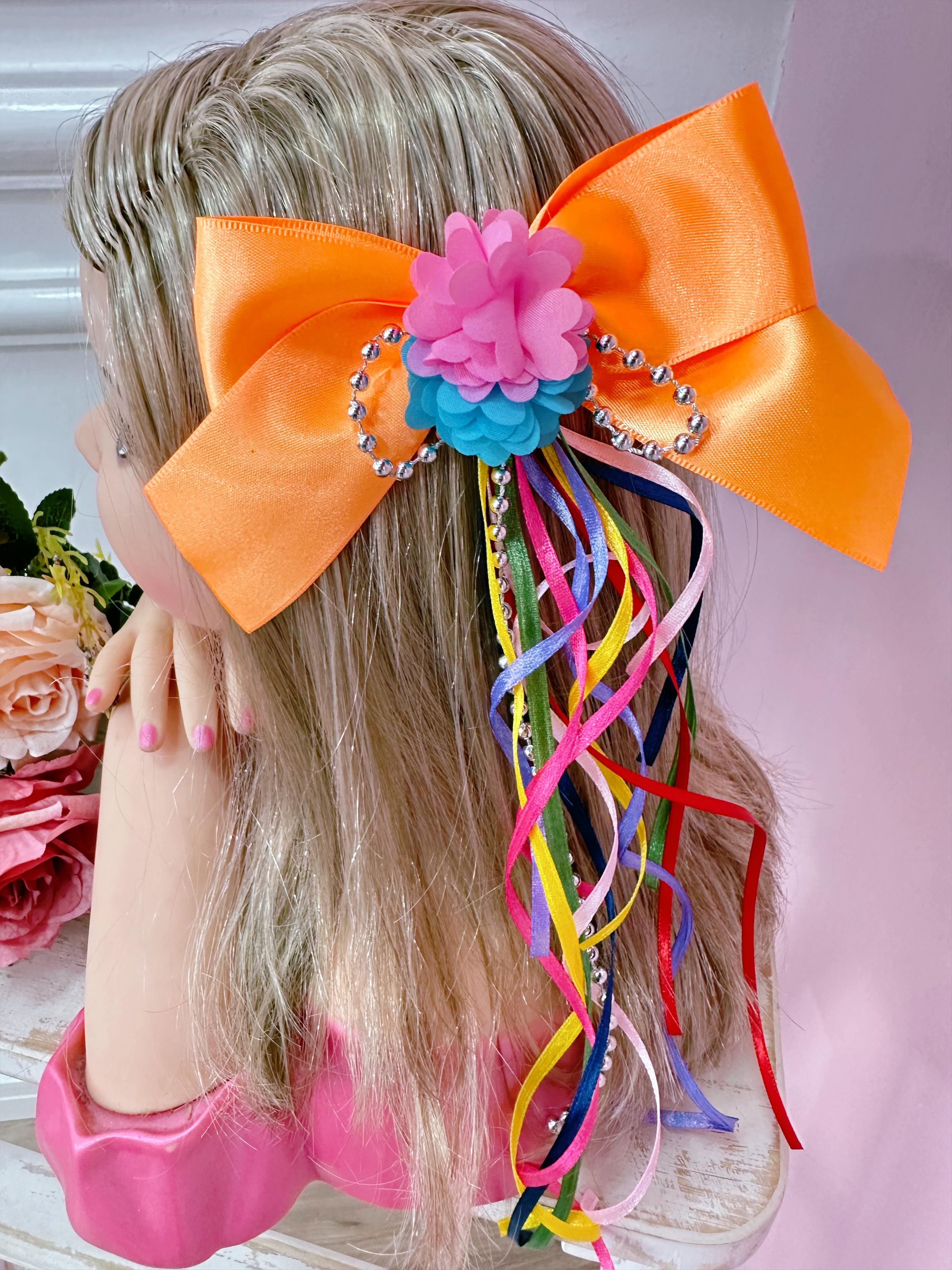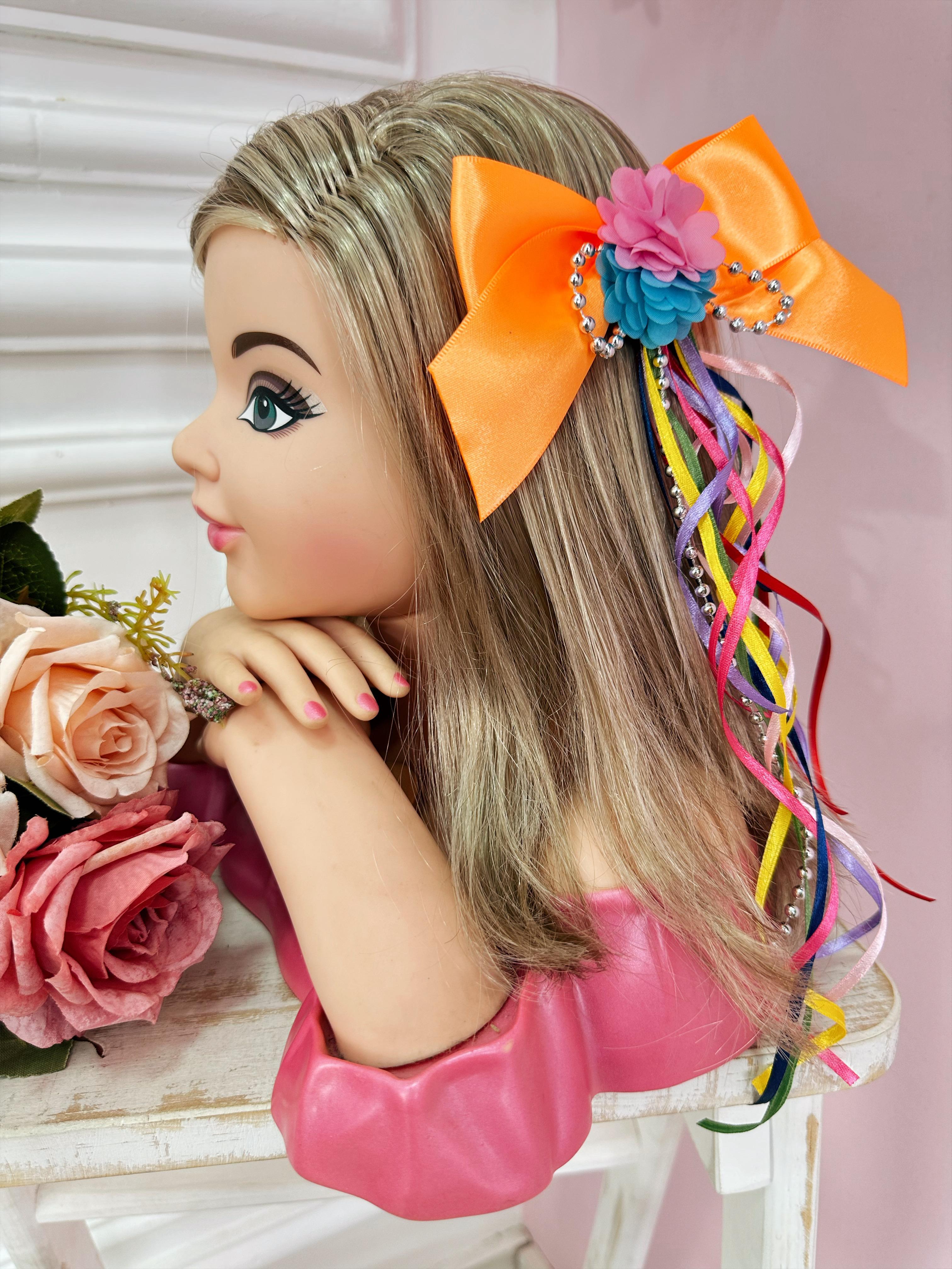 • Laço Infantil Junino Laranja Com Fitas e Aplique Flor