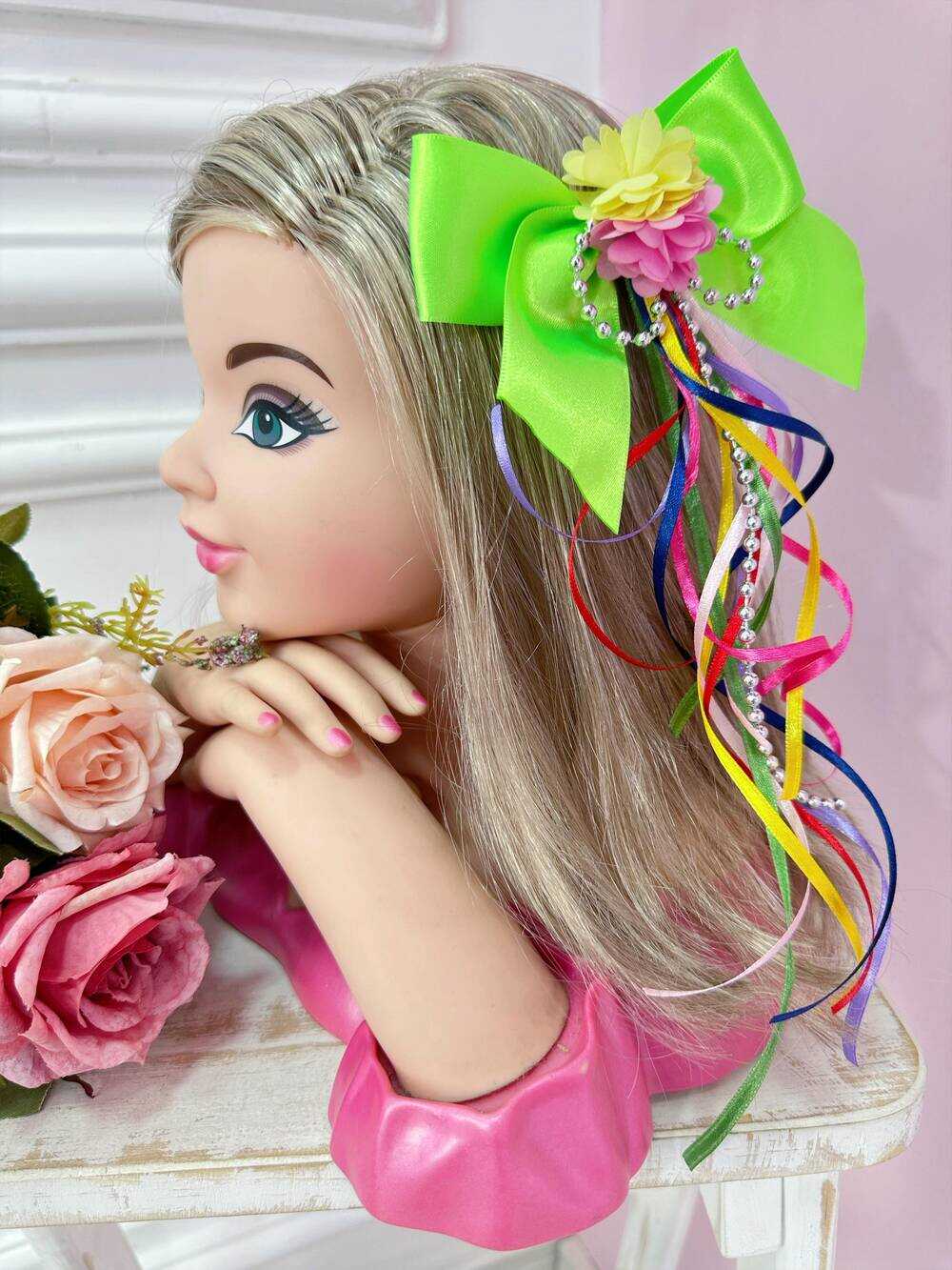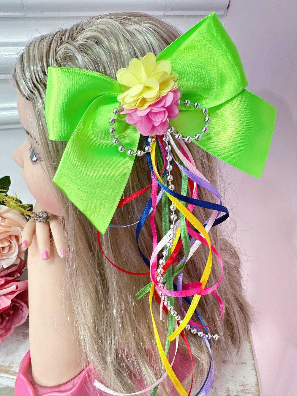 • Laço Infantil Junino Verde Lima Com Fitas e Aplique Flor