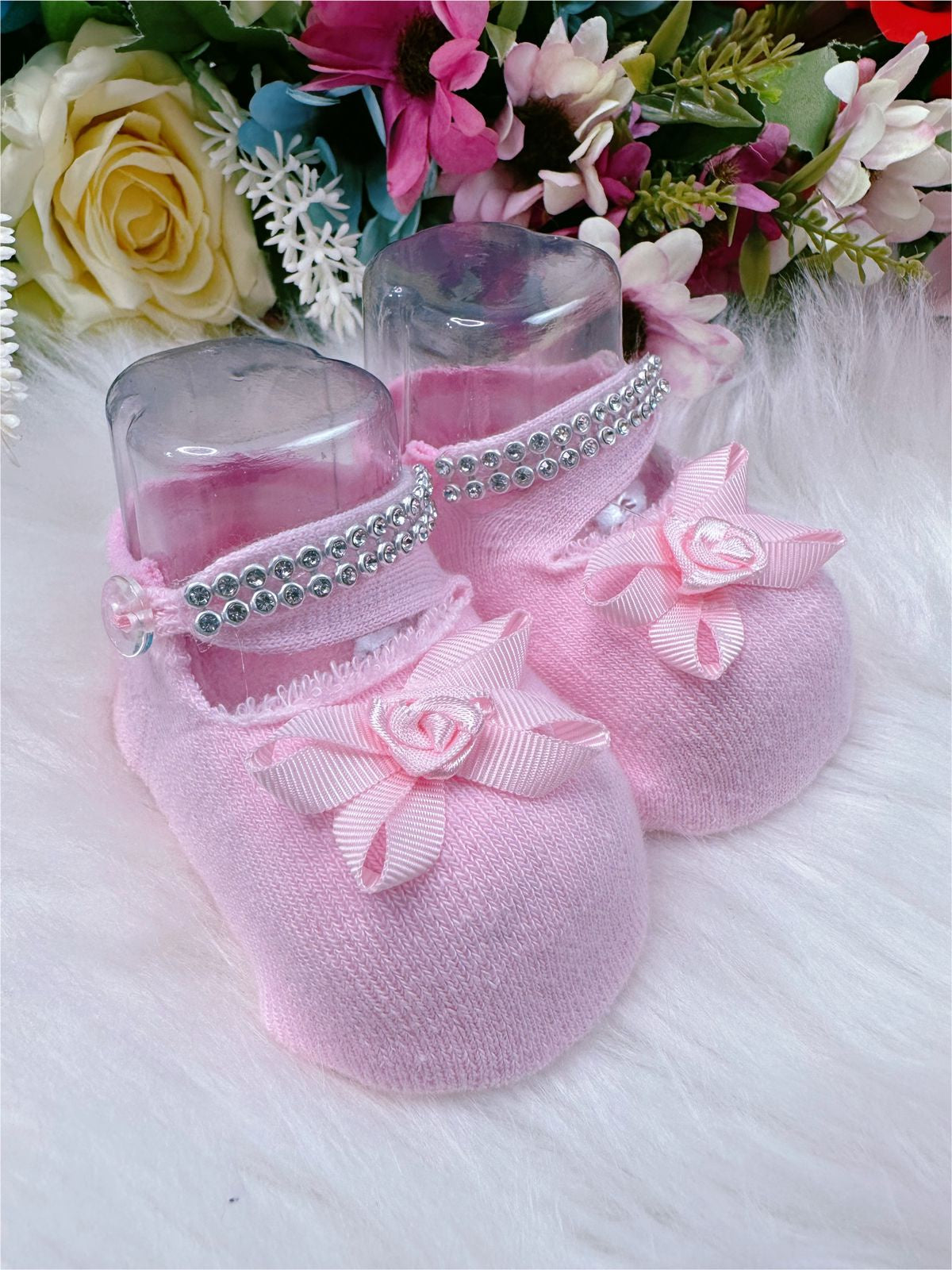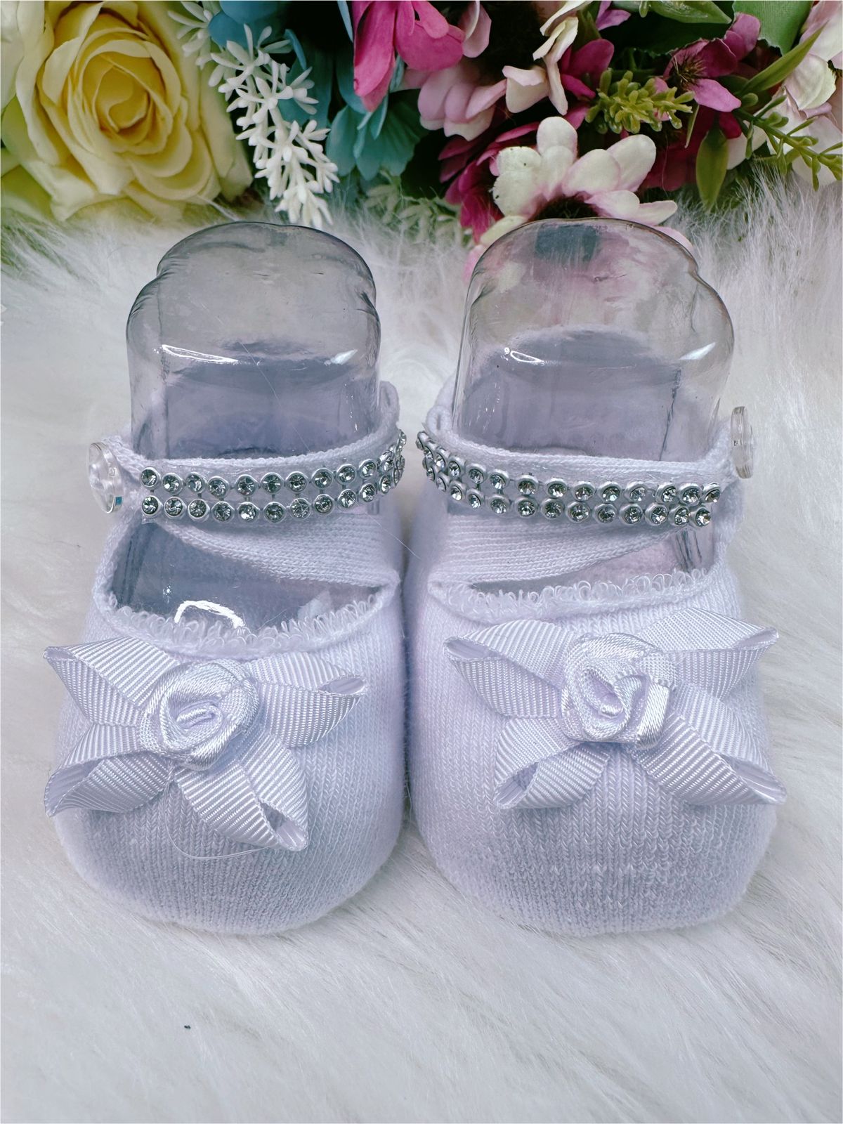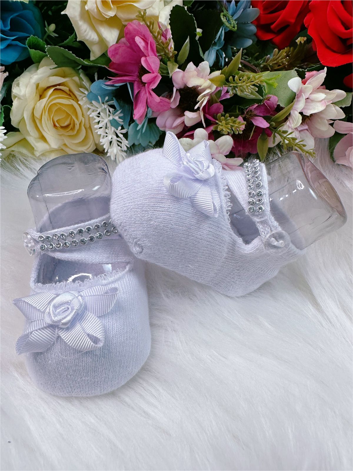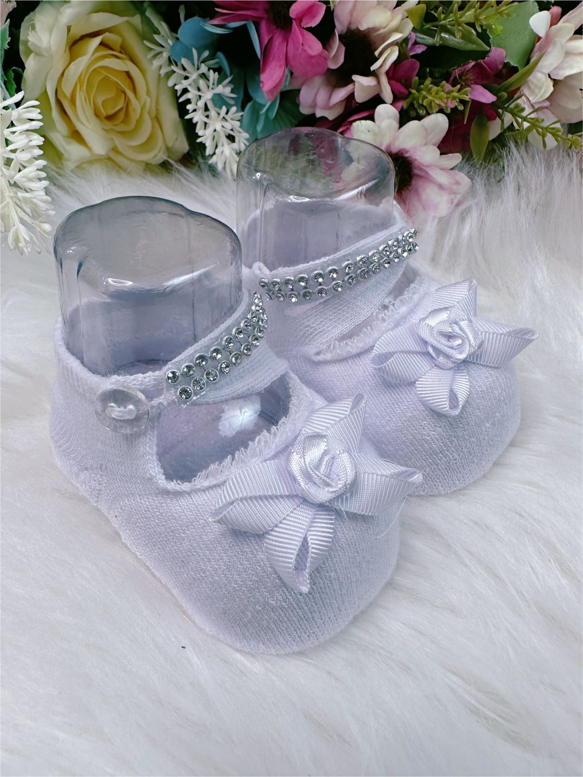 * Meia sapatinho recém nascido algodão, com strass e aplique de flor de cetim e fita gorgurão.