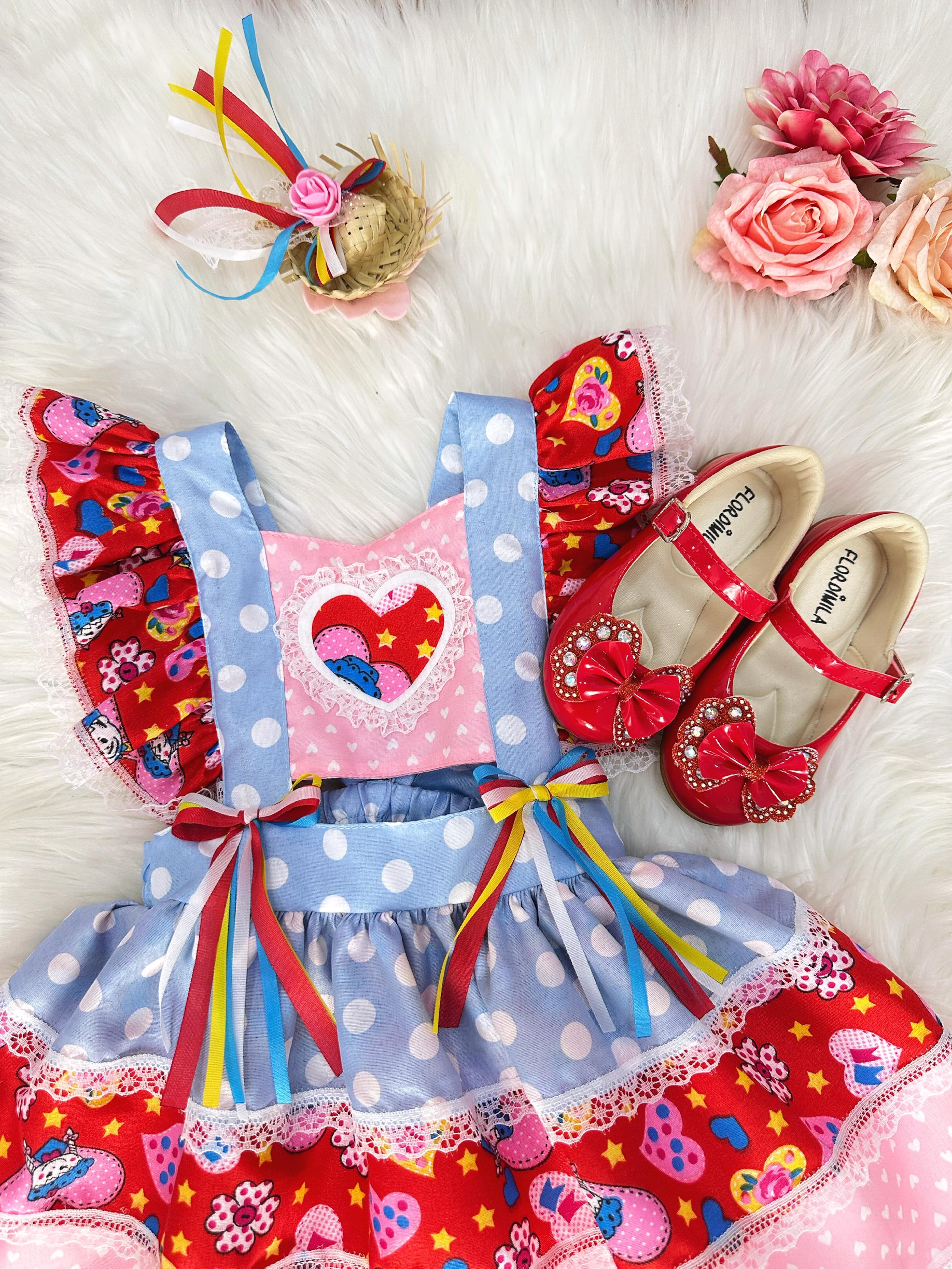 • Romper Junino Azul Colorido Com Laço de Chapéuzinho