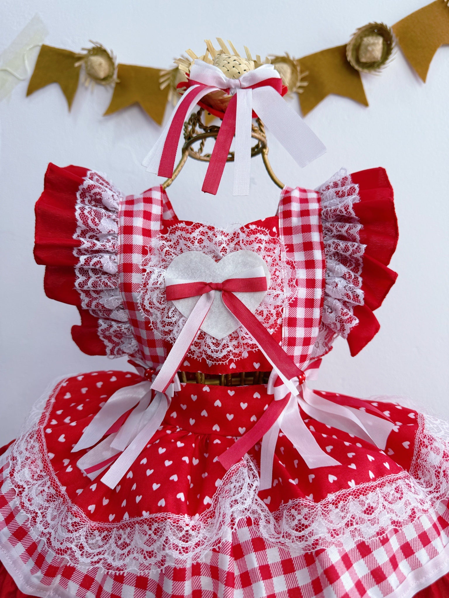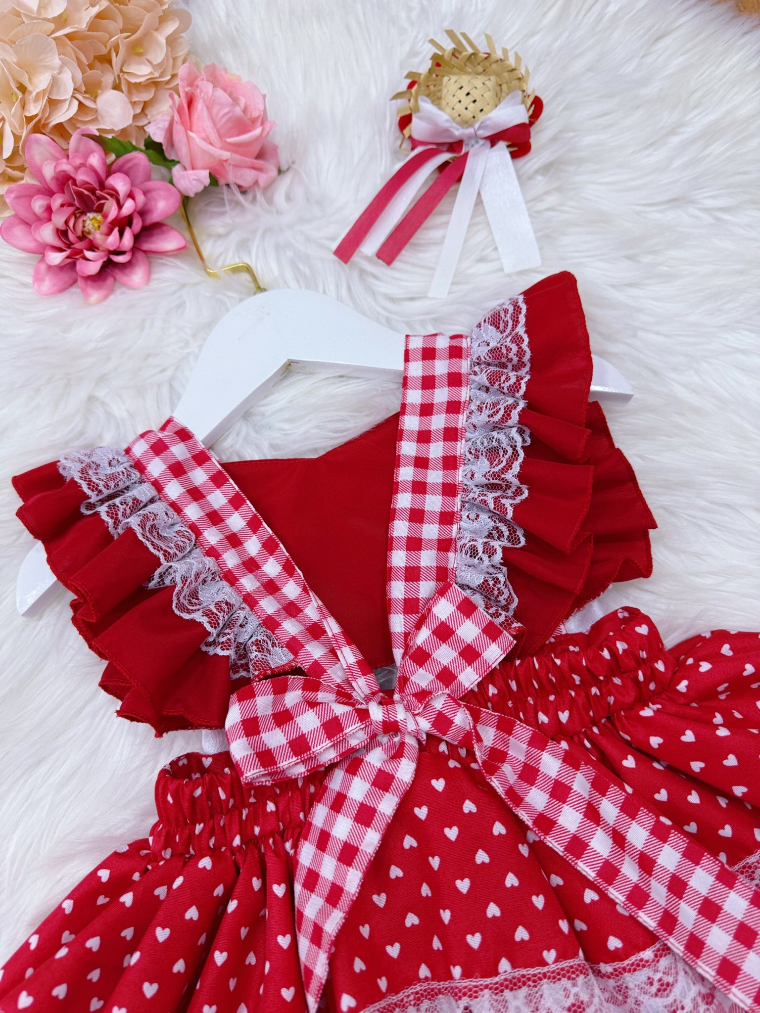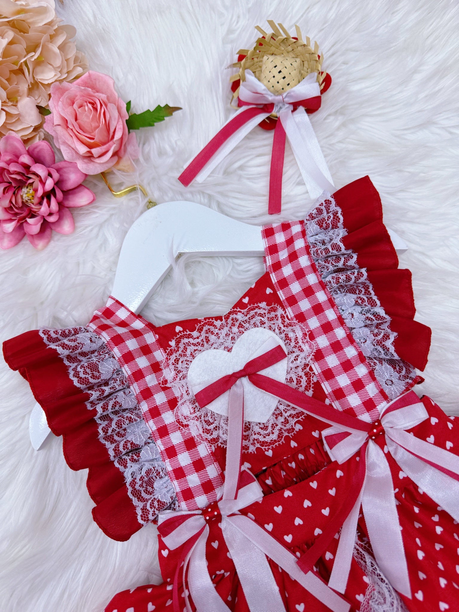 • Romper Junino Vermelho Xadrez Com Laço de Chapéuzinho