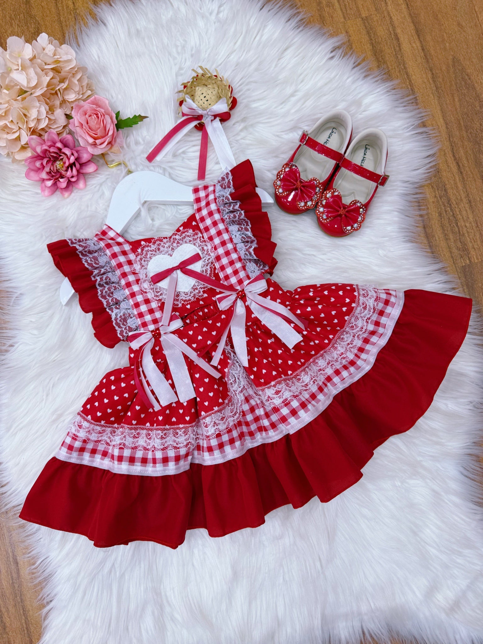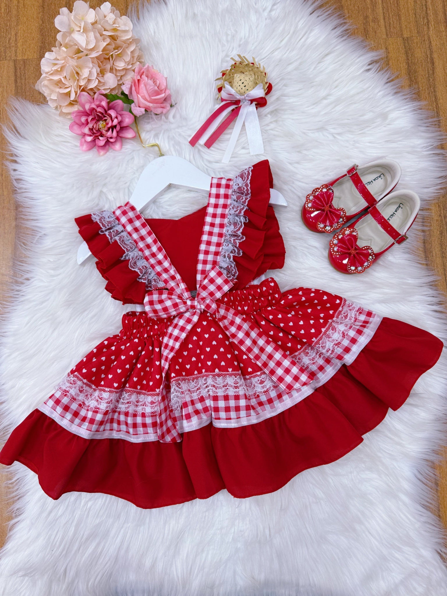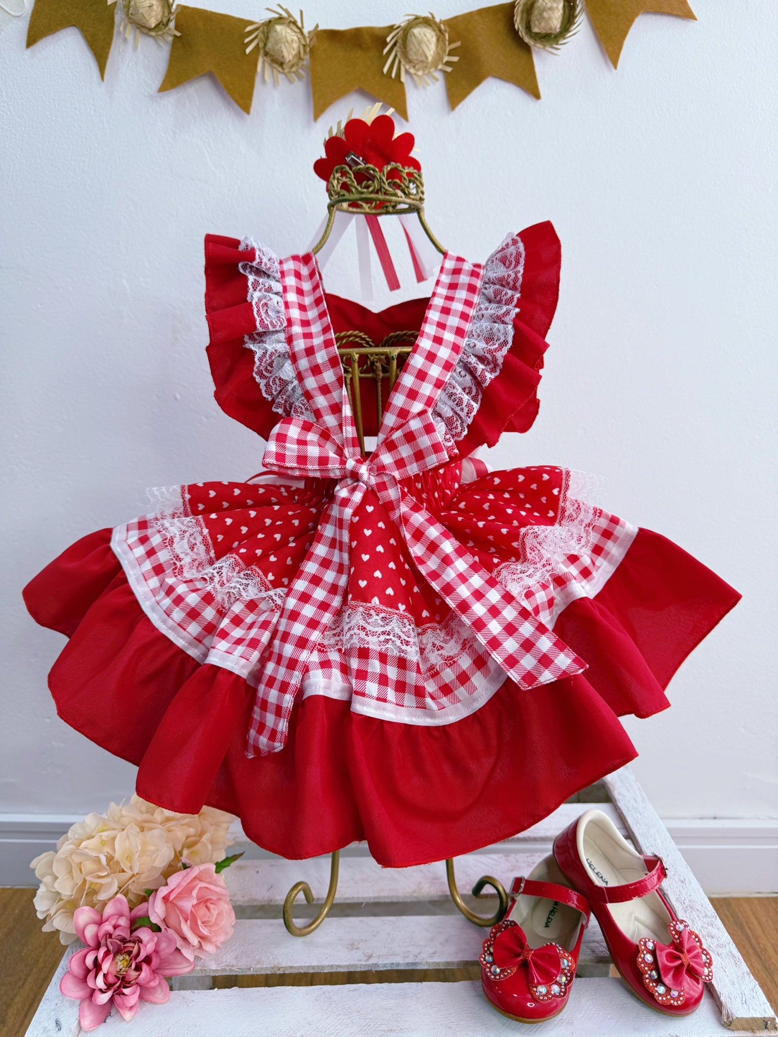 • Romper Junino Vermelho Xadrez Com Laço de Chapéuzinho