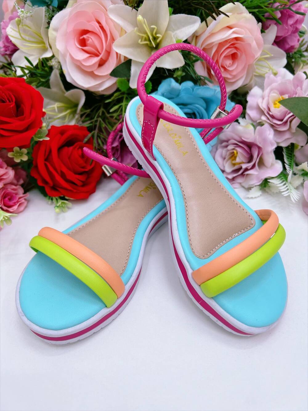 * Sandália infantil de em courino, com tiras coloridas.