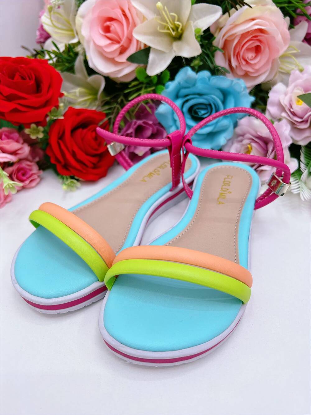 • Sandália Infantil C/ Tiras Coloridas Rasteira Azul Bebê