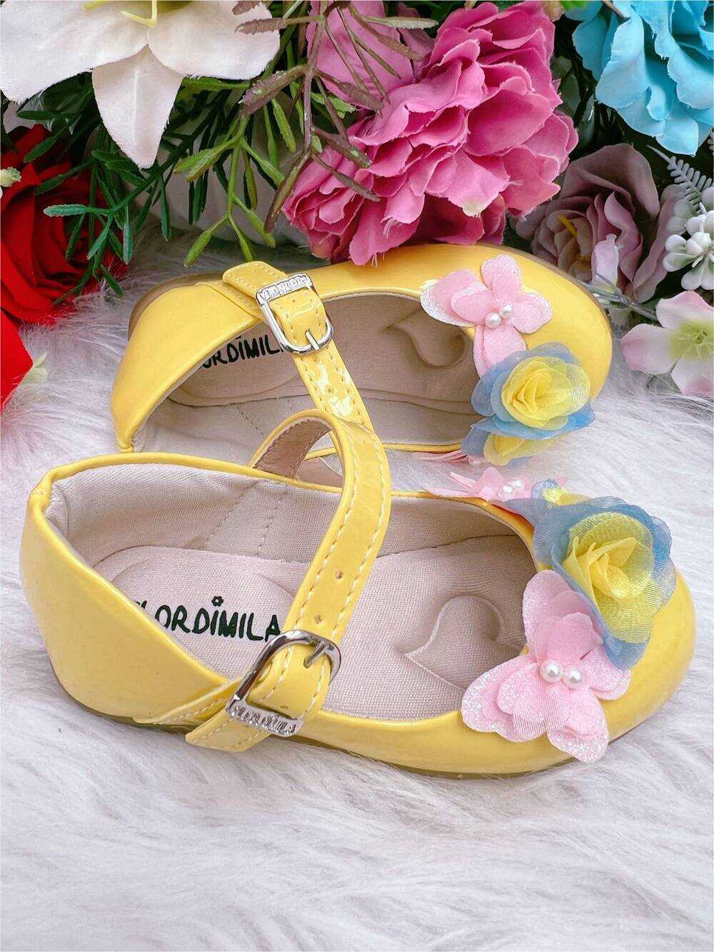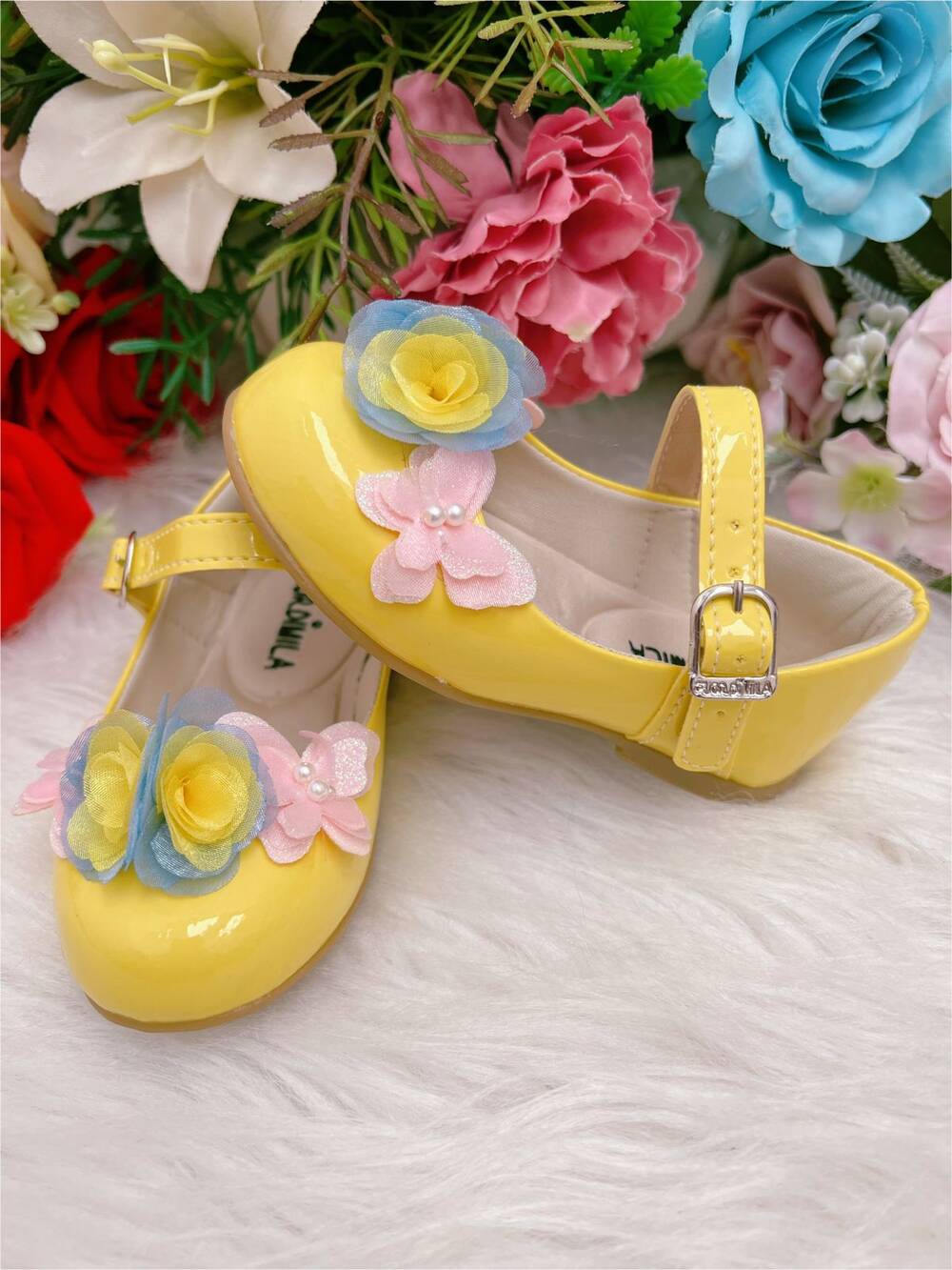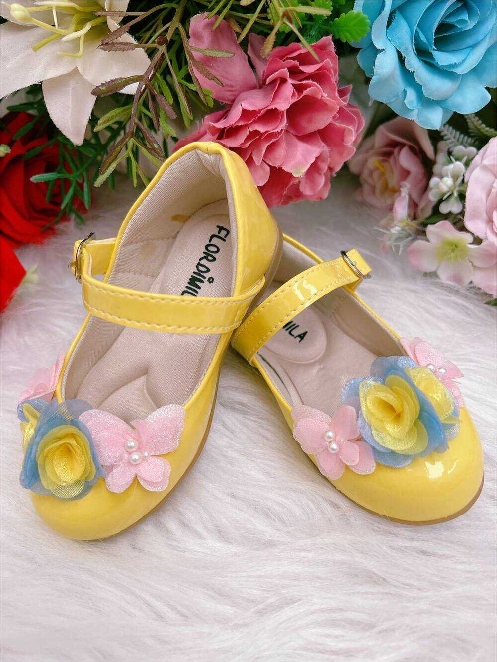 Sapatinho Amarelo Verniz Aplique Borboleta e Flor