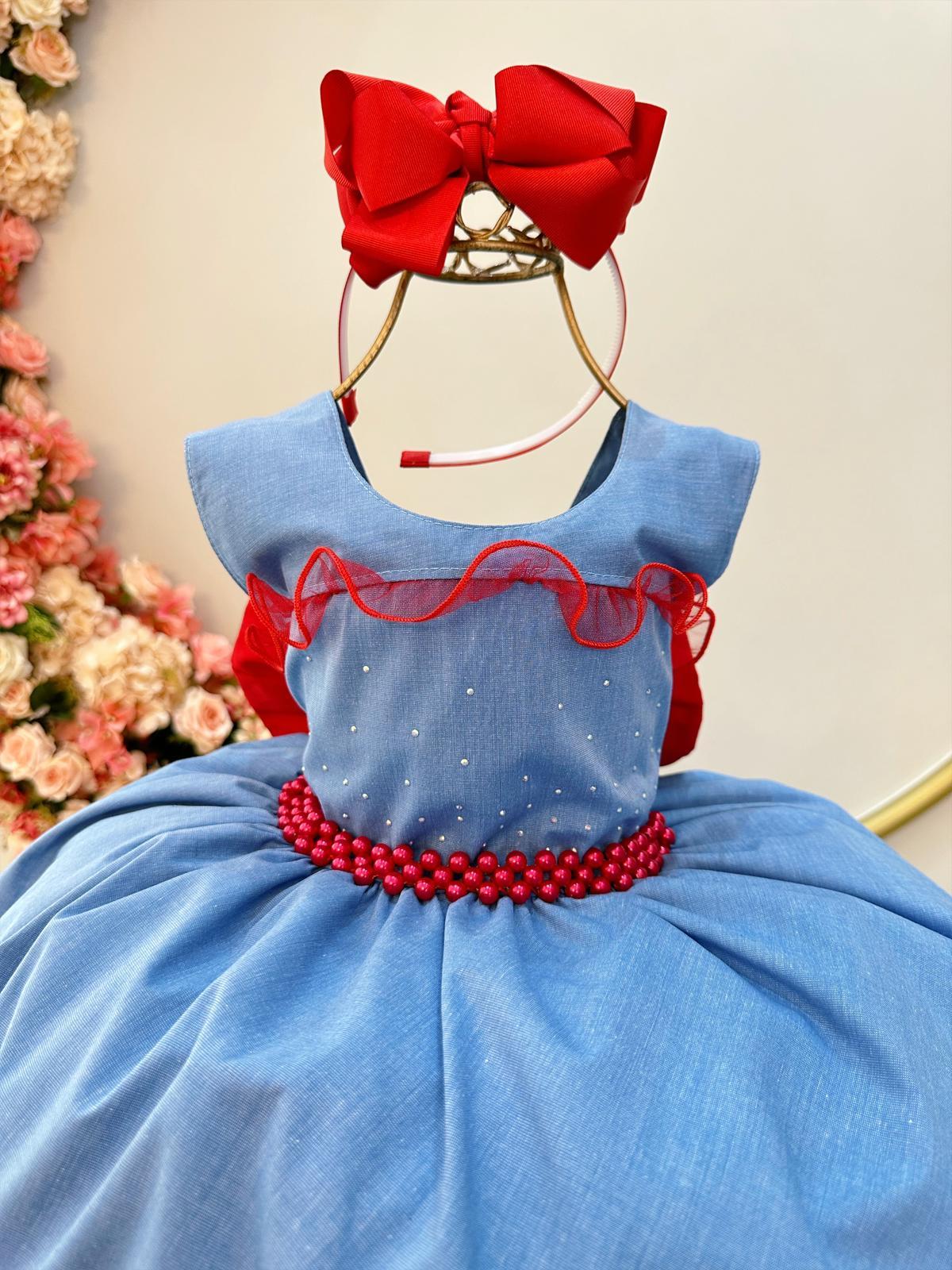 • Vestido Infantil Azul Busto Strass e Saia Com Babado Luxo