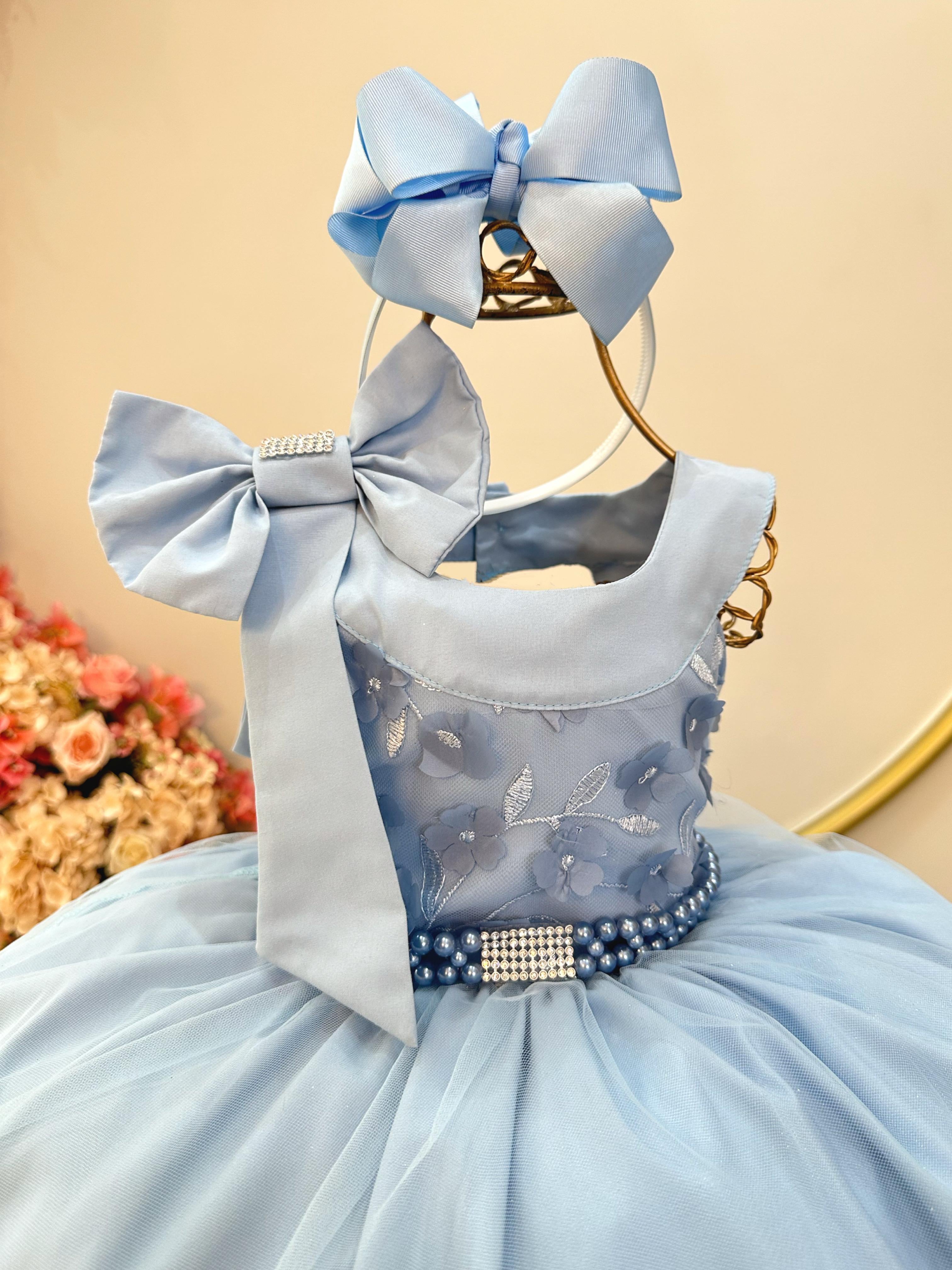 Vestido Infantil Azul Claro Busto Com Renda Damas Festas