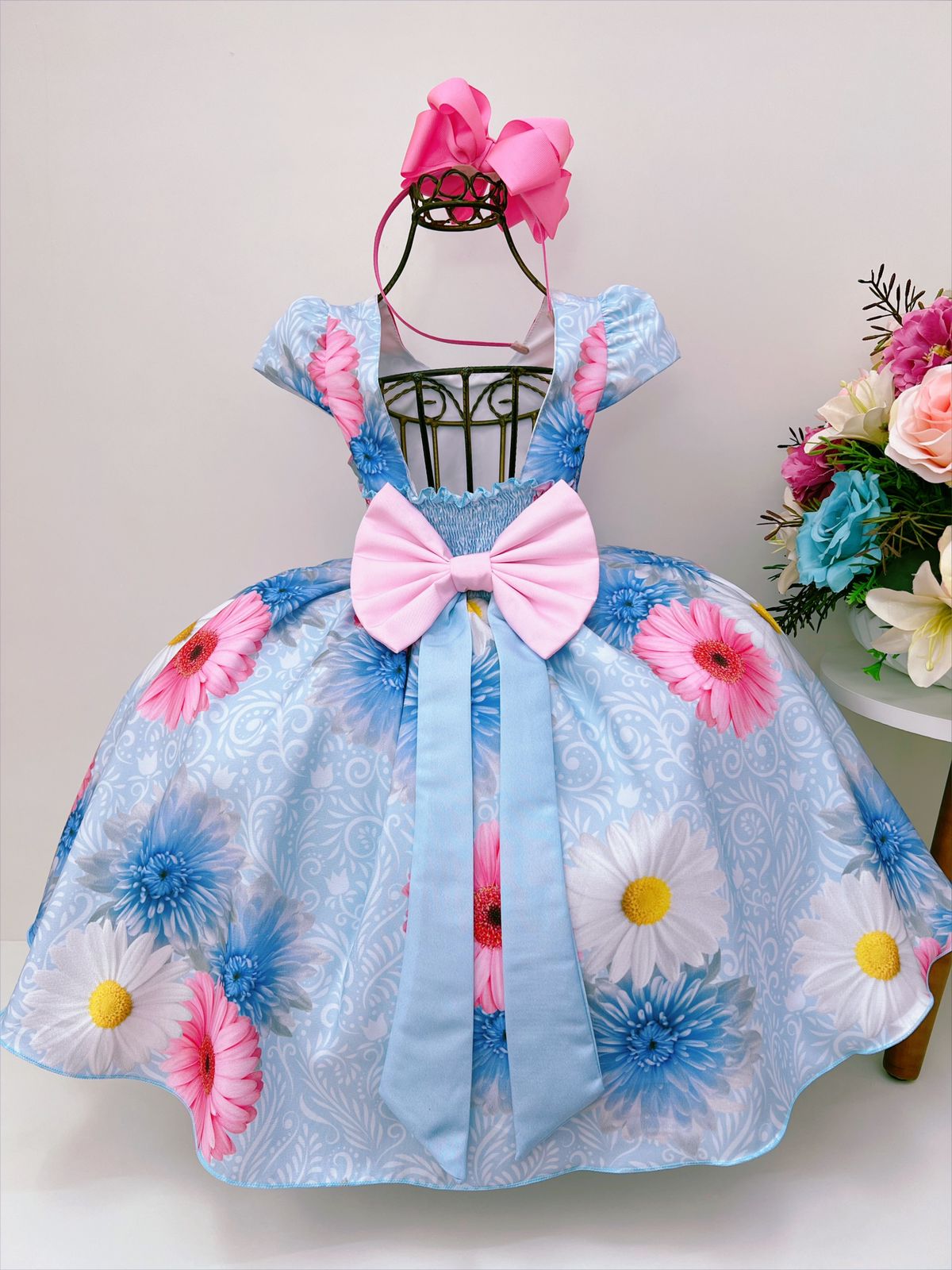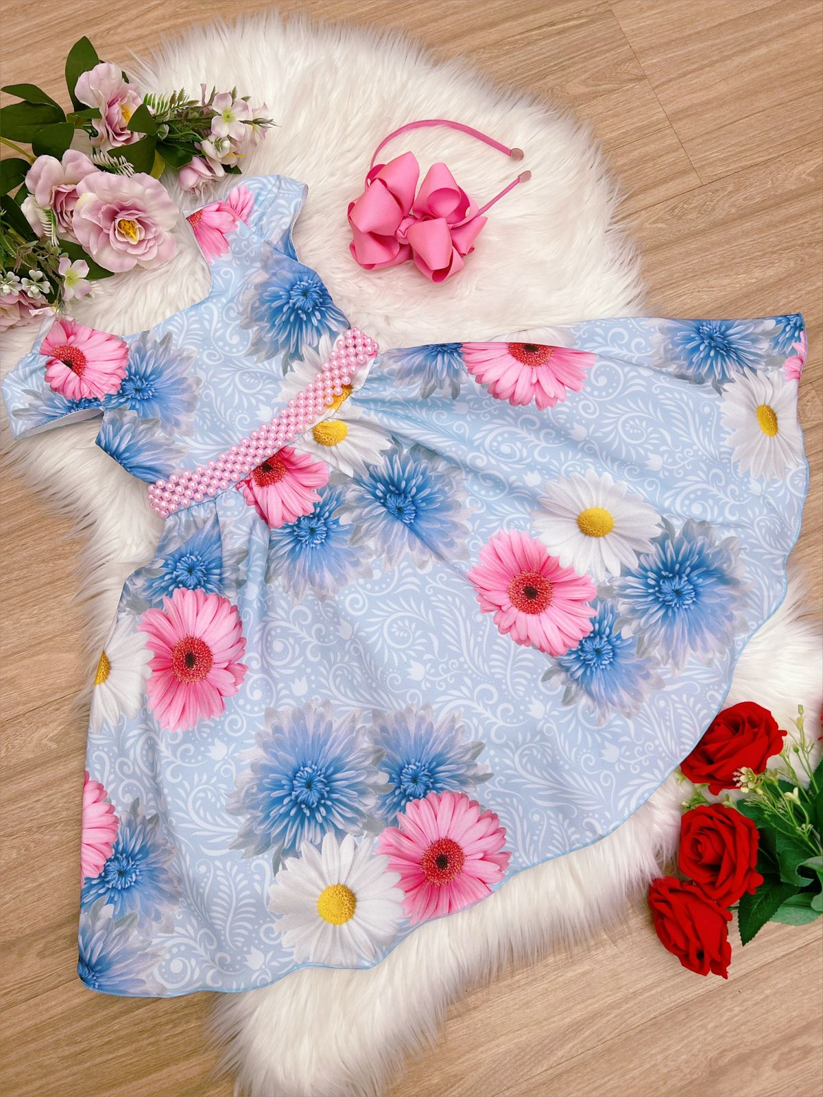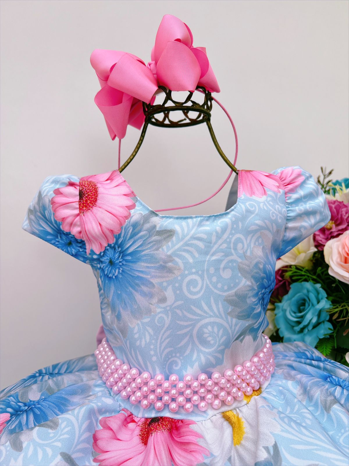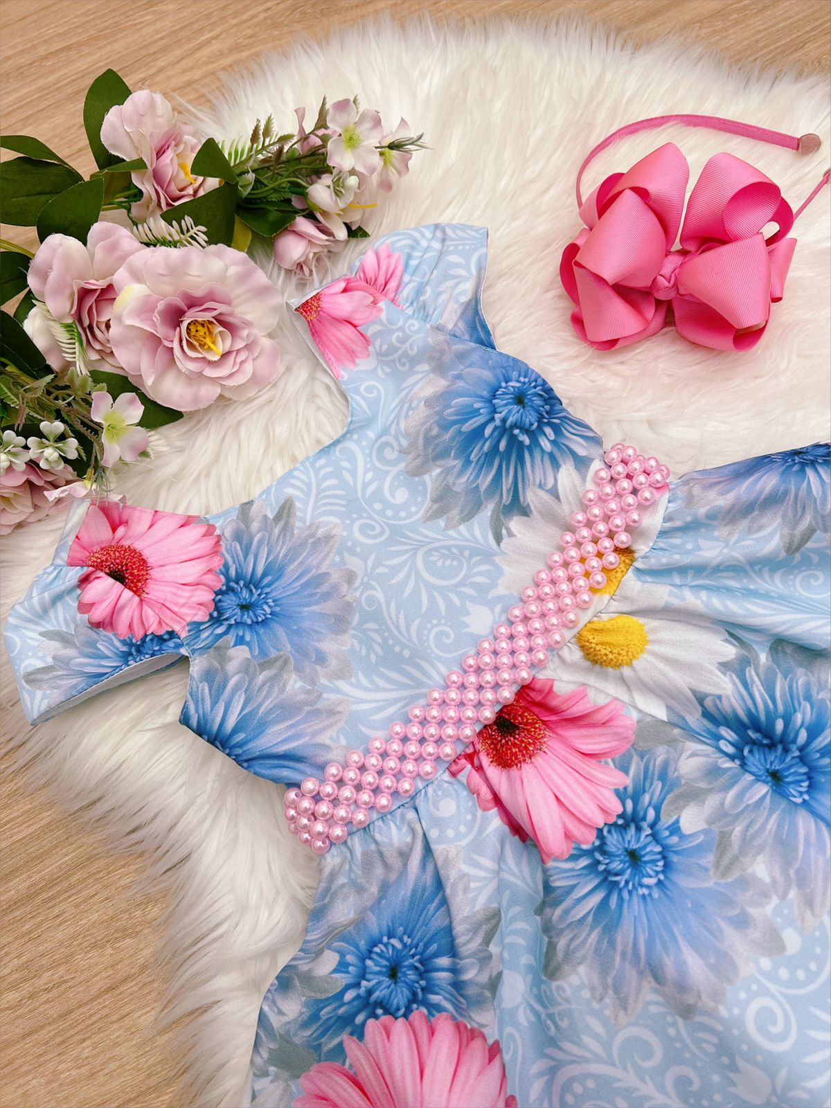 Vestido Infantil Azul Florido Com Cinto de Pérolas