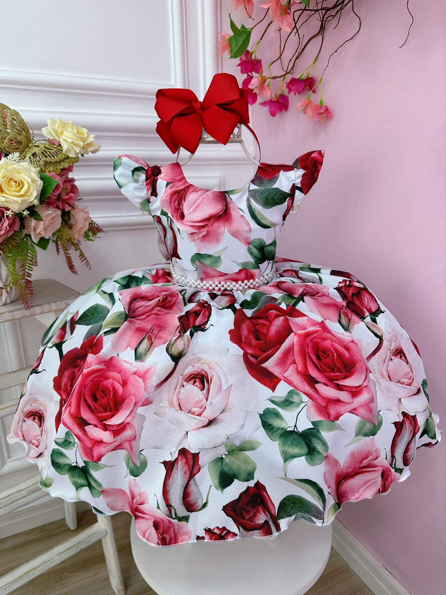 Vestido Infantil Branco Florido de Rosas Cinto Pérolas Festa