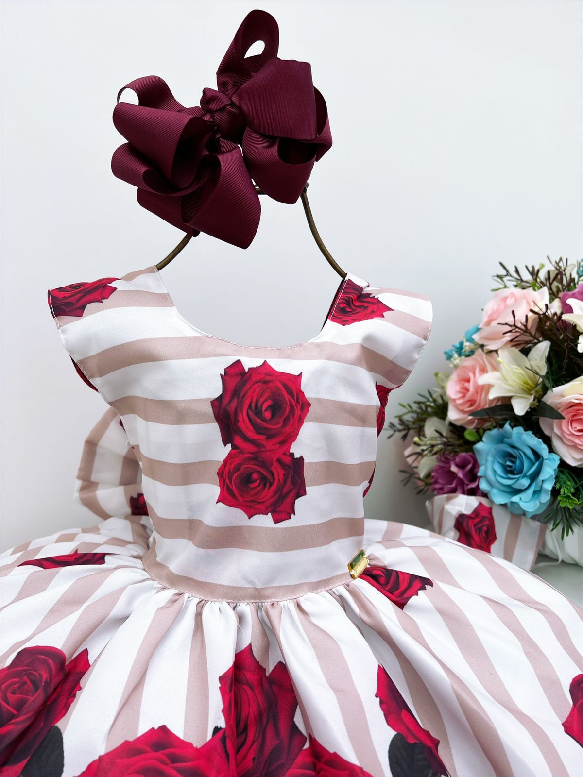 • Vestido Infantil Floral Marsala Listras Horizontal Luxo