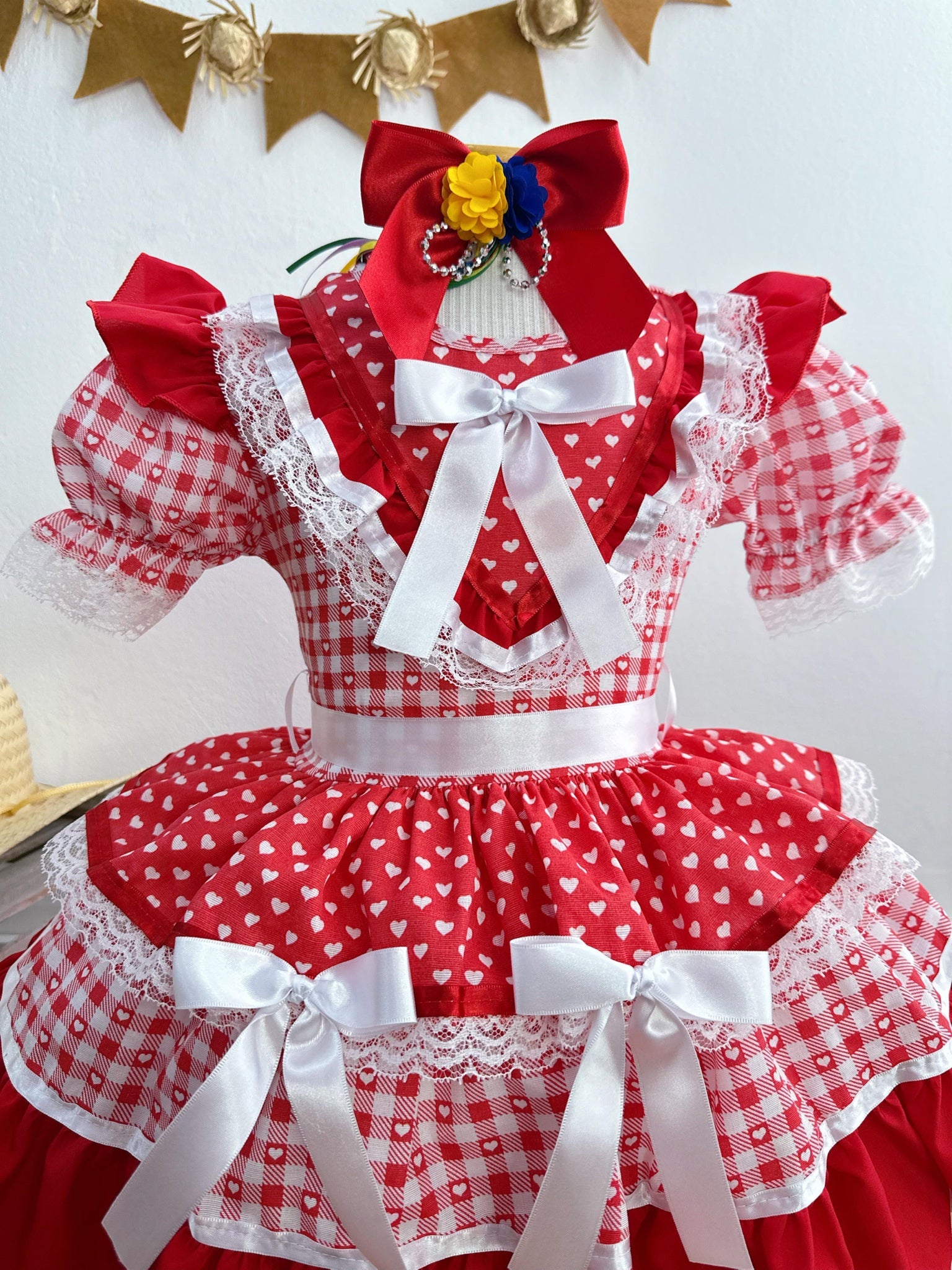 • Vestido Infantil Junino Arraiá Vermelho Xadrez C/ Babados