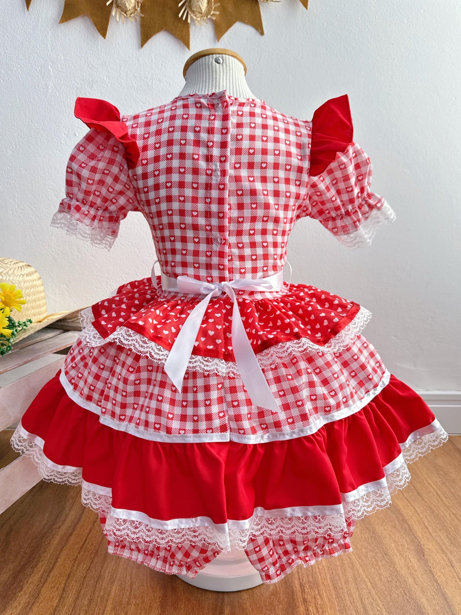 Vestido Infantil Junino Arraiá Vermelho Xadrez C/ Babados