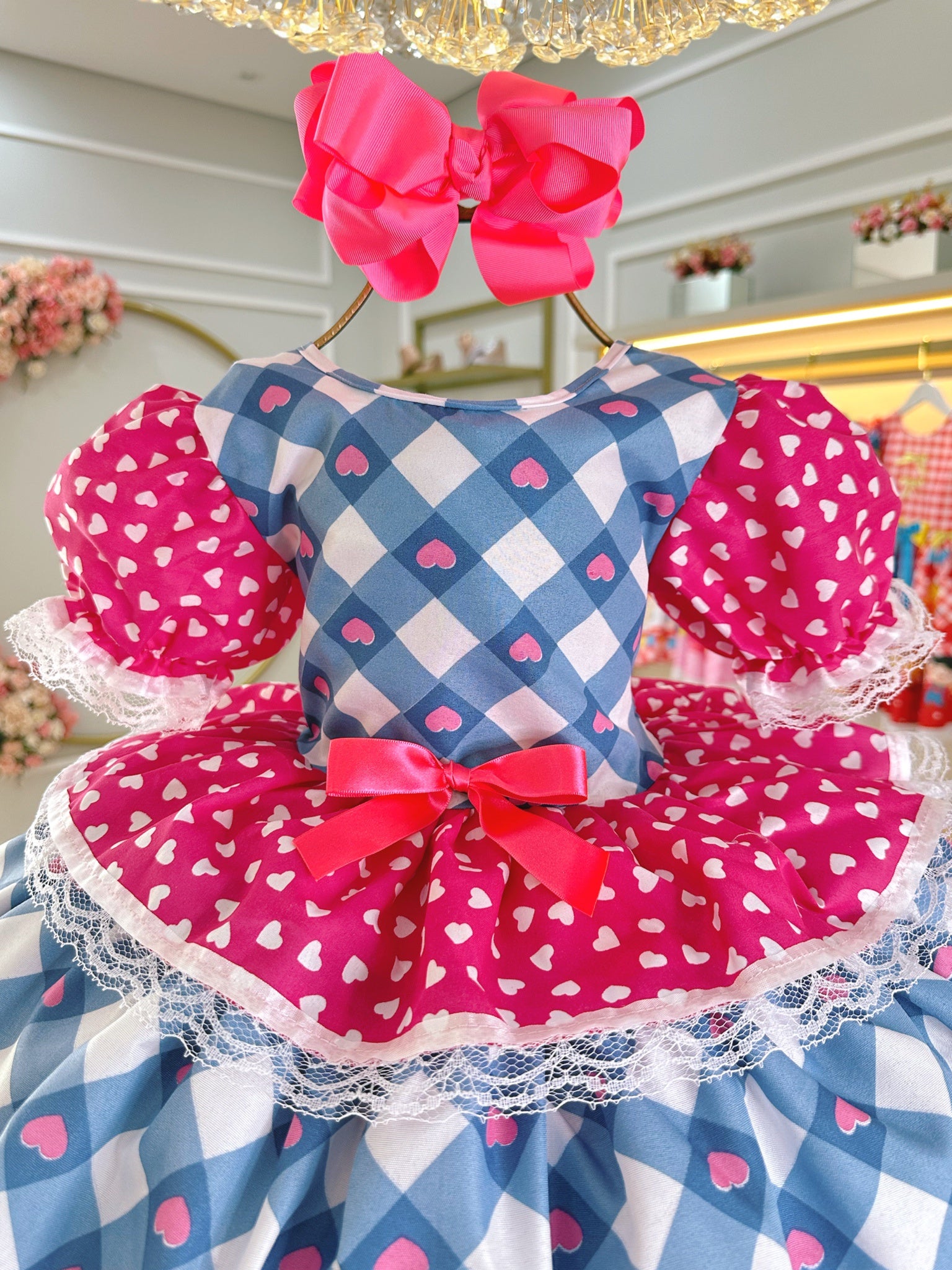 • Vestido Infantil Junino Caipira Azul Xadrez Colorido Corações