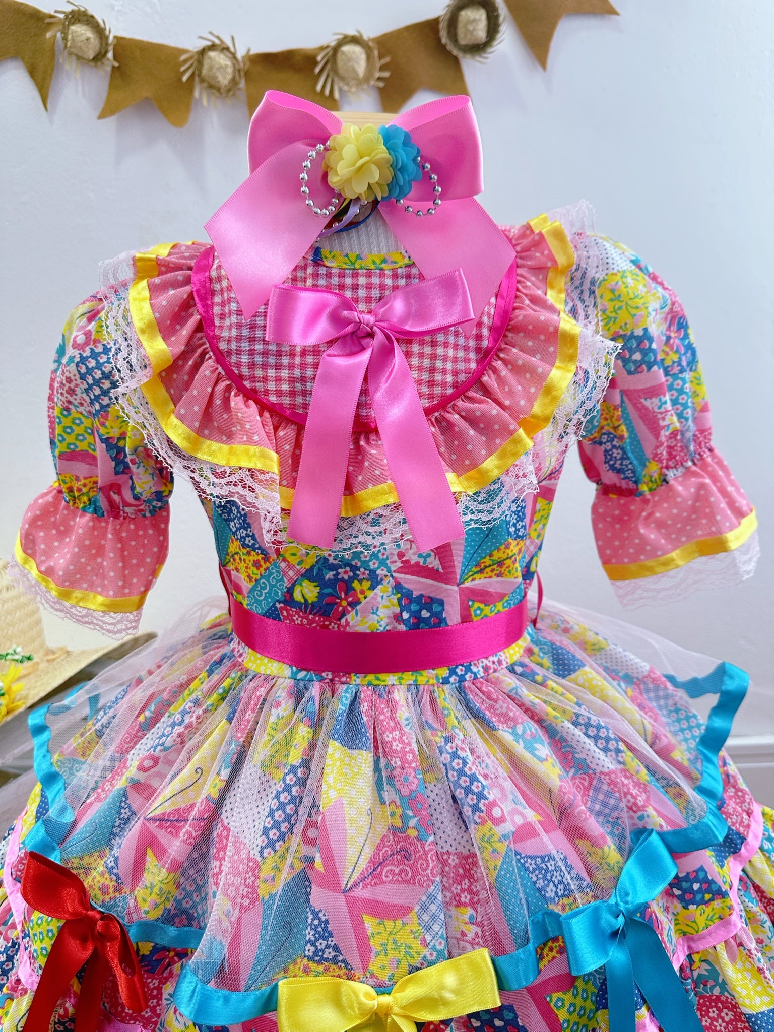• Vestido Infantil Junino Rosa Com Estampa Colorida Festas