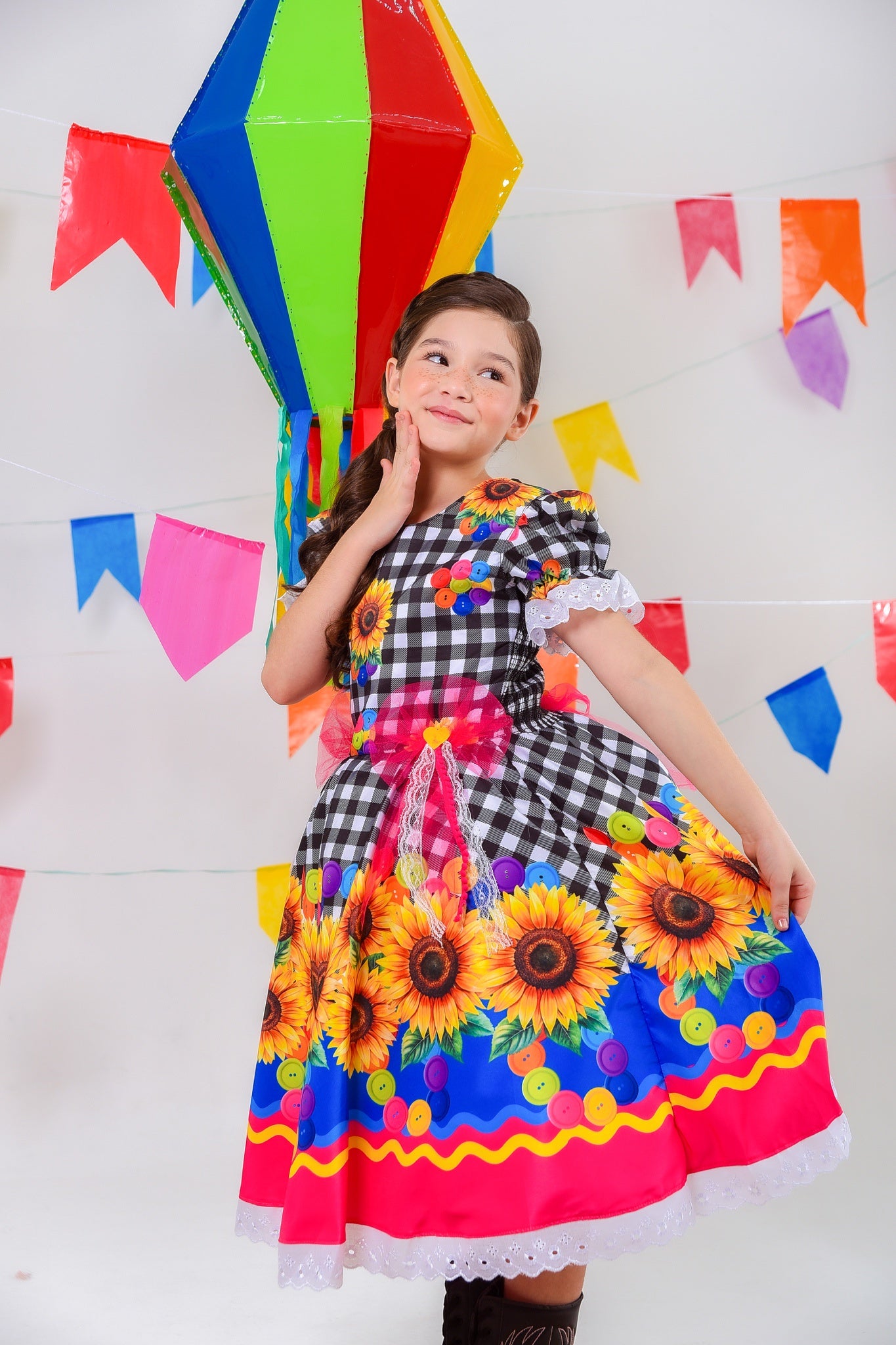 • Vestido Infantil Junino Xadrez Branco e Preto Girassol Luxo