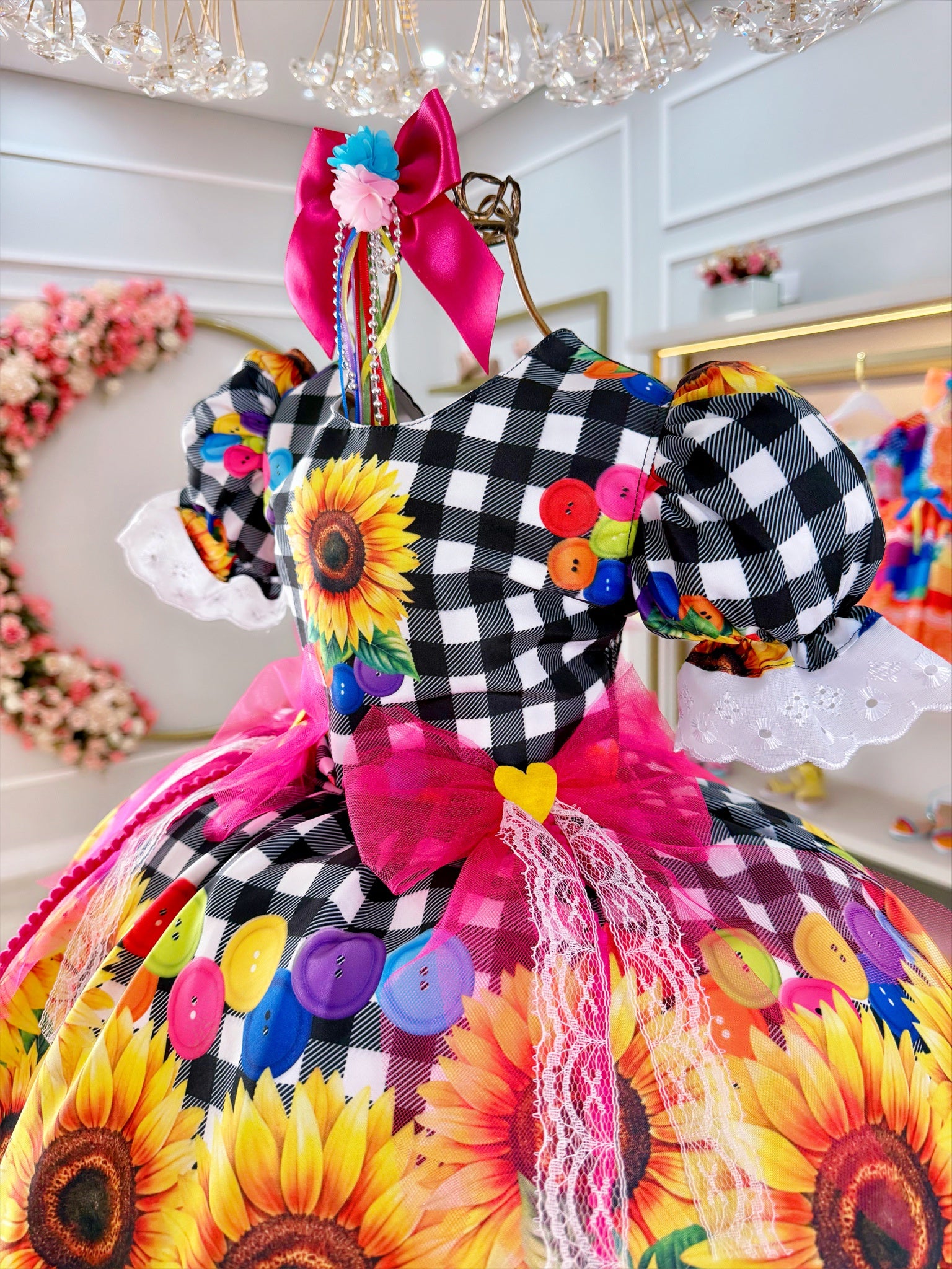 Vestido Infantil Junino Xadrez Branco e Preto Girassol Luxo