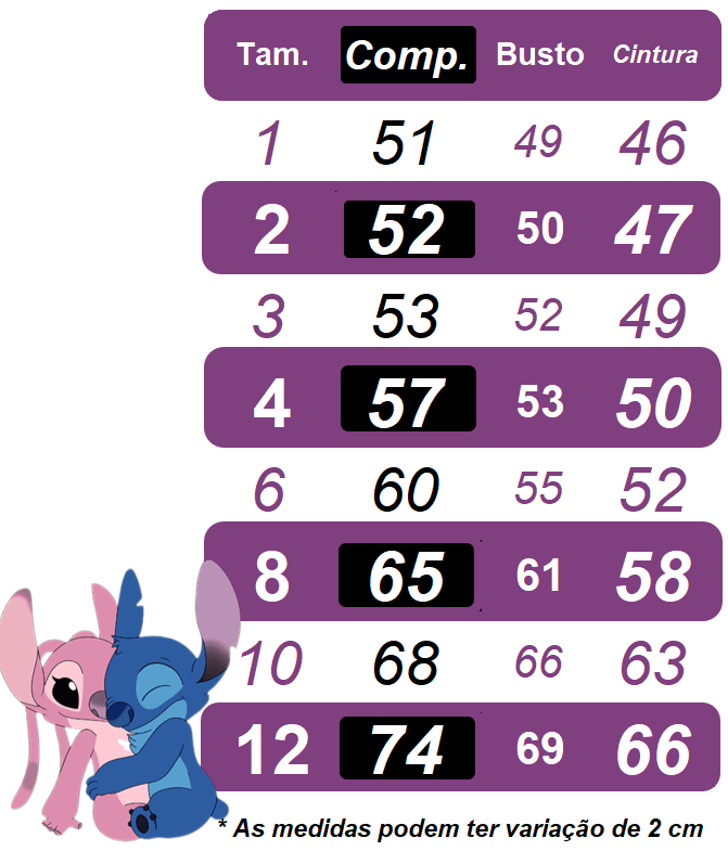 Tamanho:comprei tamanho 6 ,não ficou grande ficou tamanho exato,minha criança tem 4 anos e é magrinha,caso suas crianças forem gordinha pega um tamanho a mais,mas qualidade ótima, nós amamos ele, estão de parabéns 👏👏👏