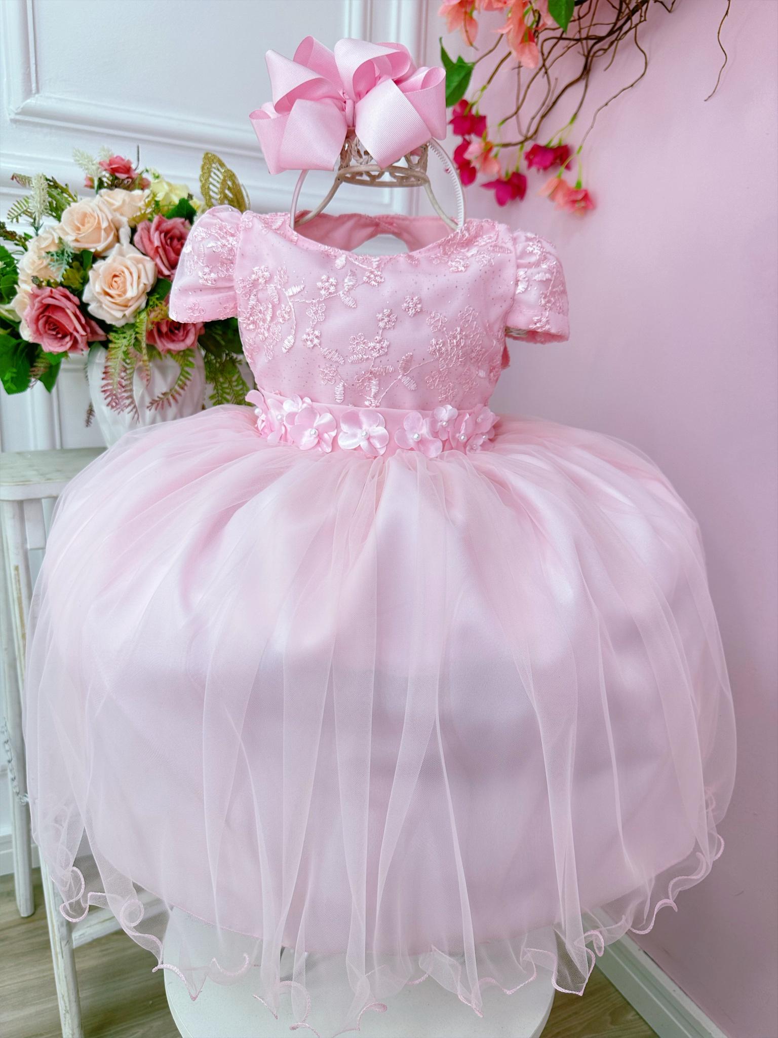 Vestido Infantil Rosa Bebê C/ Renda e Aplique Flores Festas