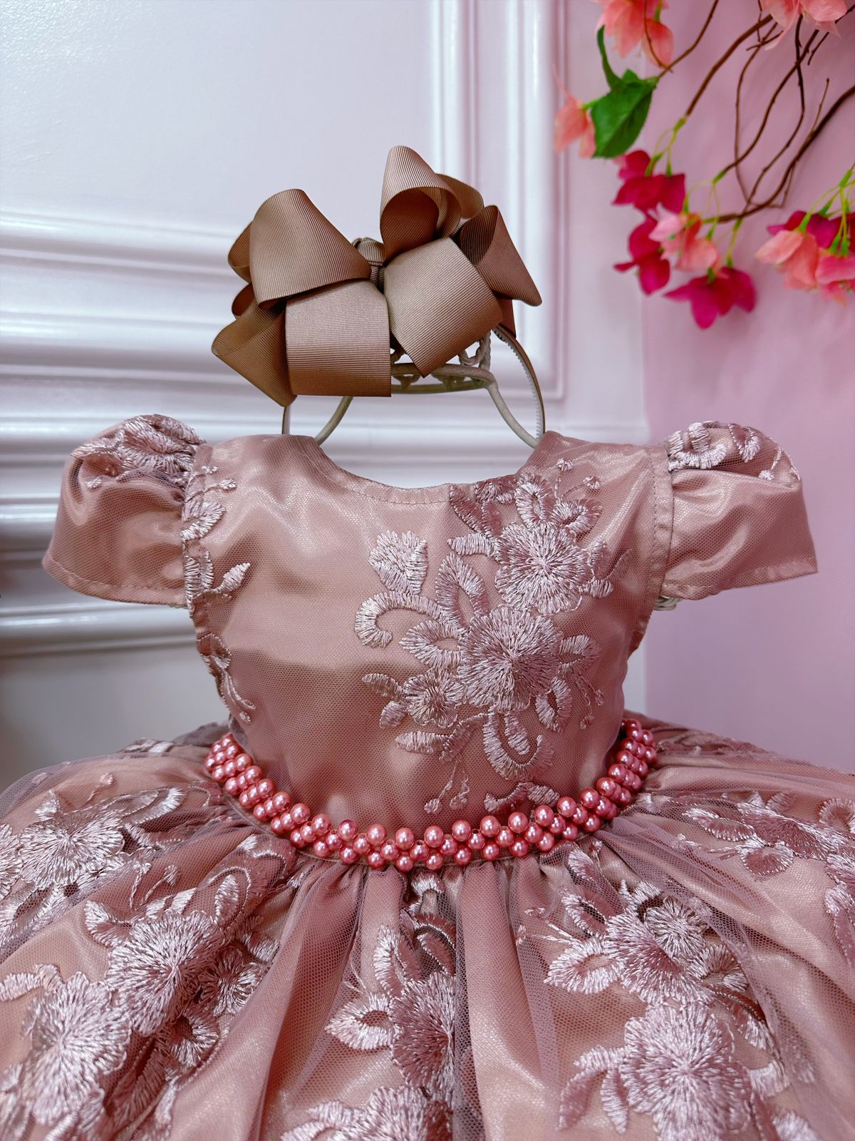 • Vestido Infantil Rose Com Renda Realeza e Cinto de Pérolas