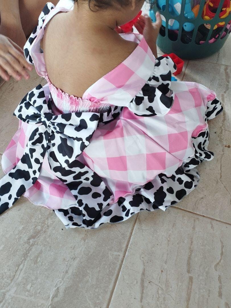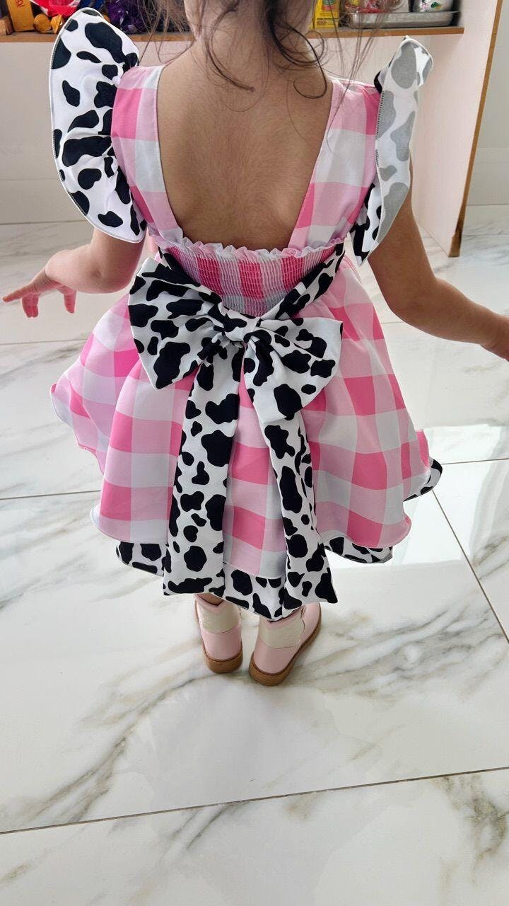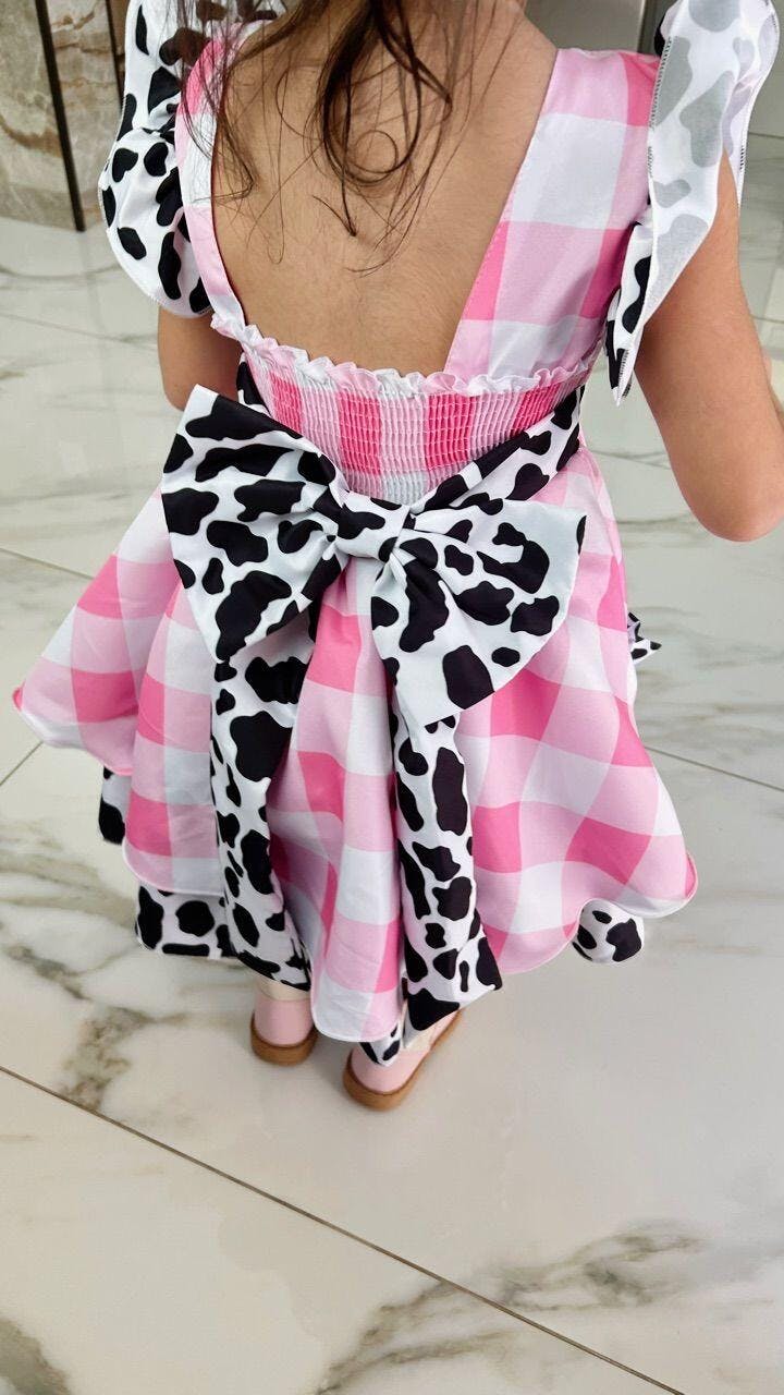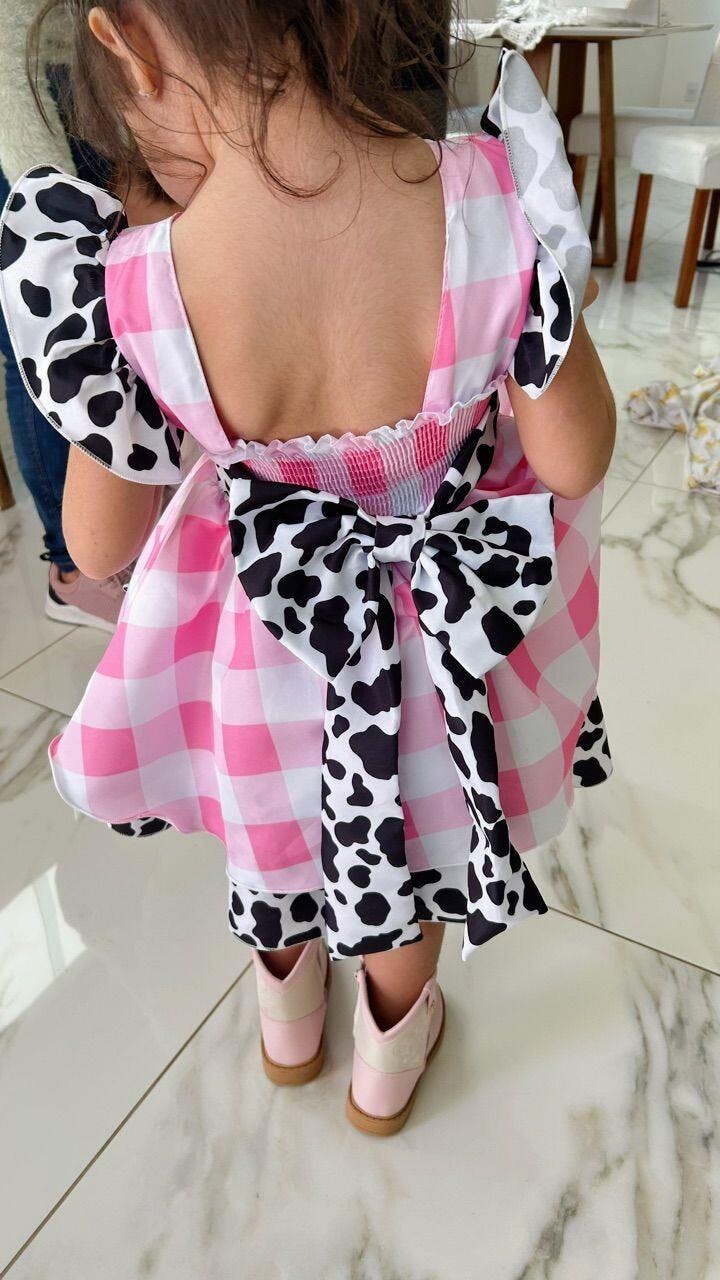 • Vestido Infantil Xadrez Branco Rosa Fazendinha Vaquinha Laço